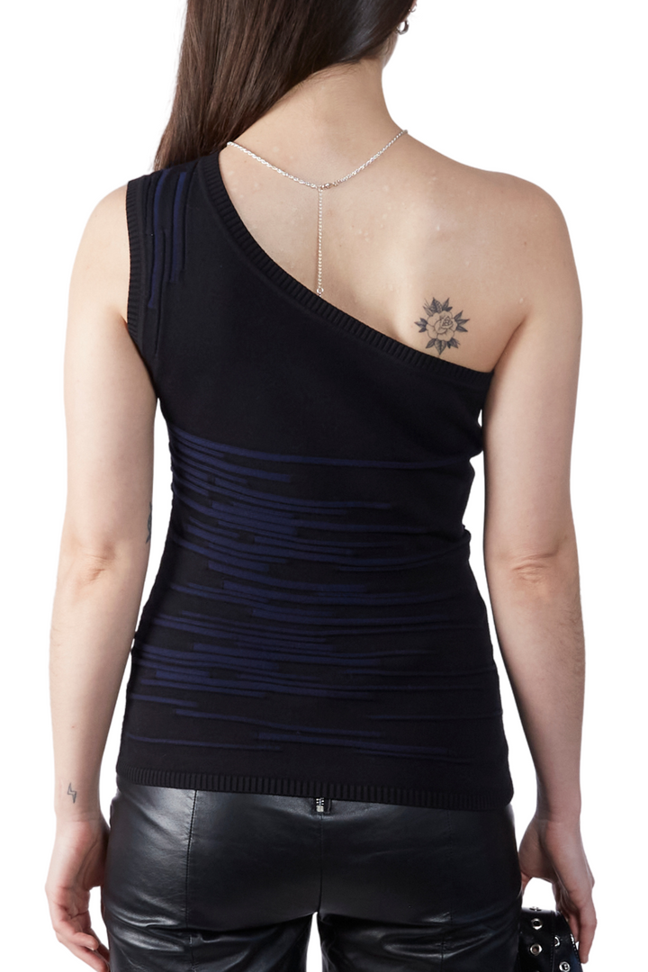 Asymmetrical knitted one shoulder top crafted using the jacquard technique. Featuring a ribbed knit stitch creating an uneven rectangular detailing inspired by 90s computer analog patterns. Designed with a close to body fit.