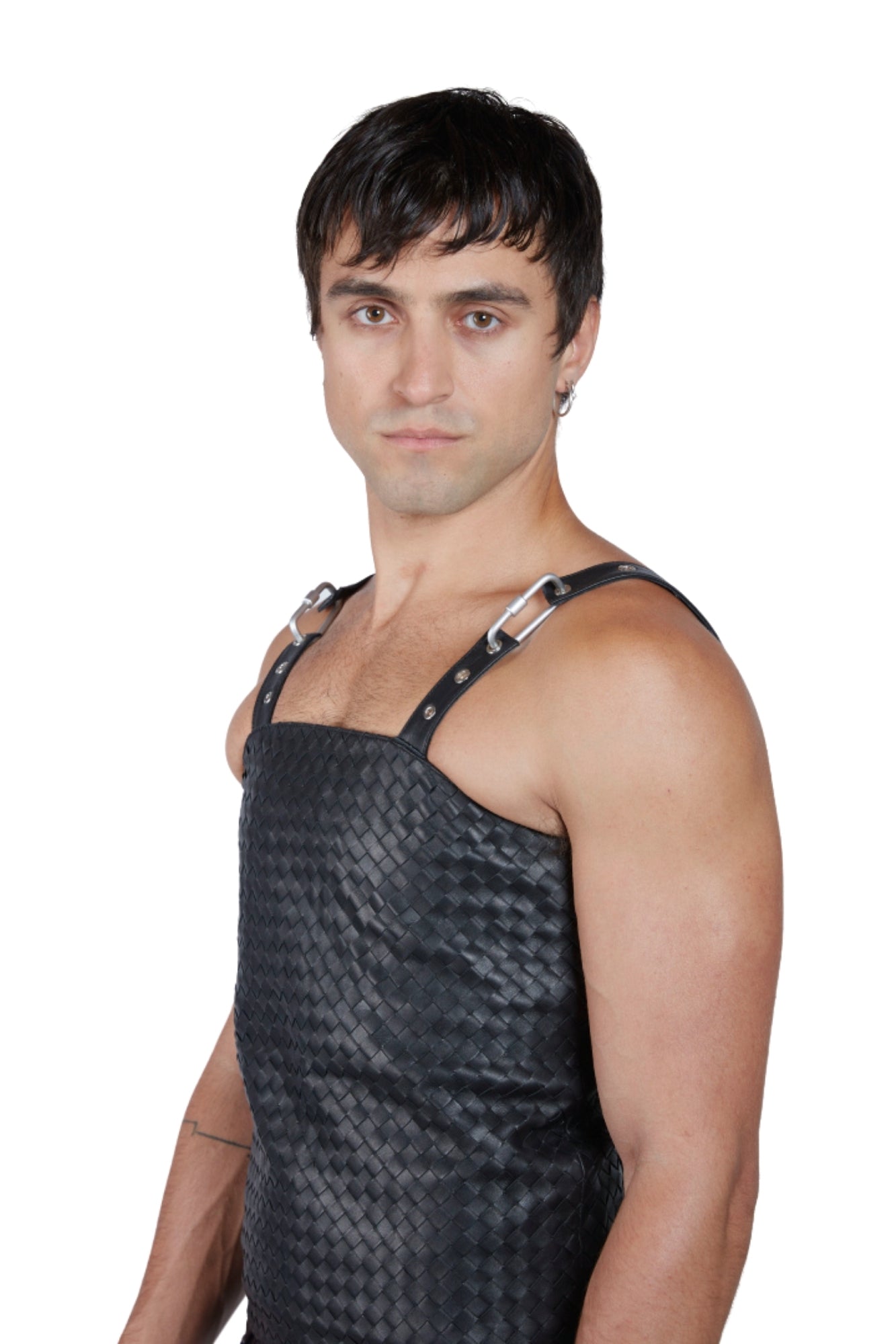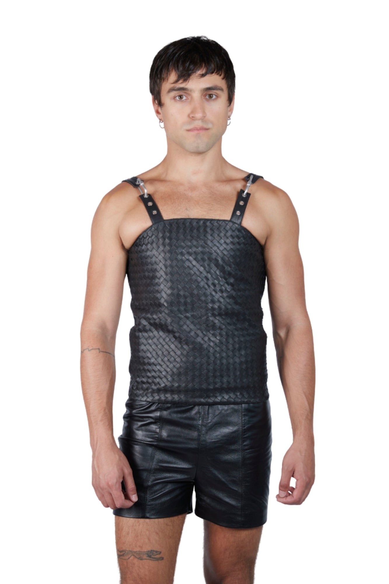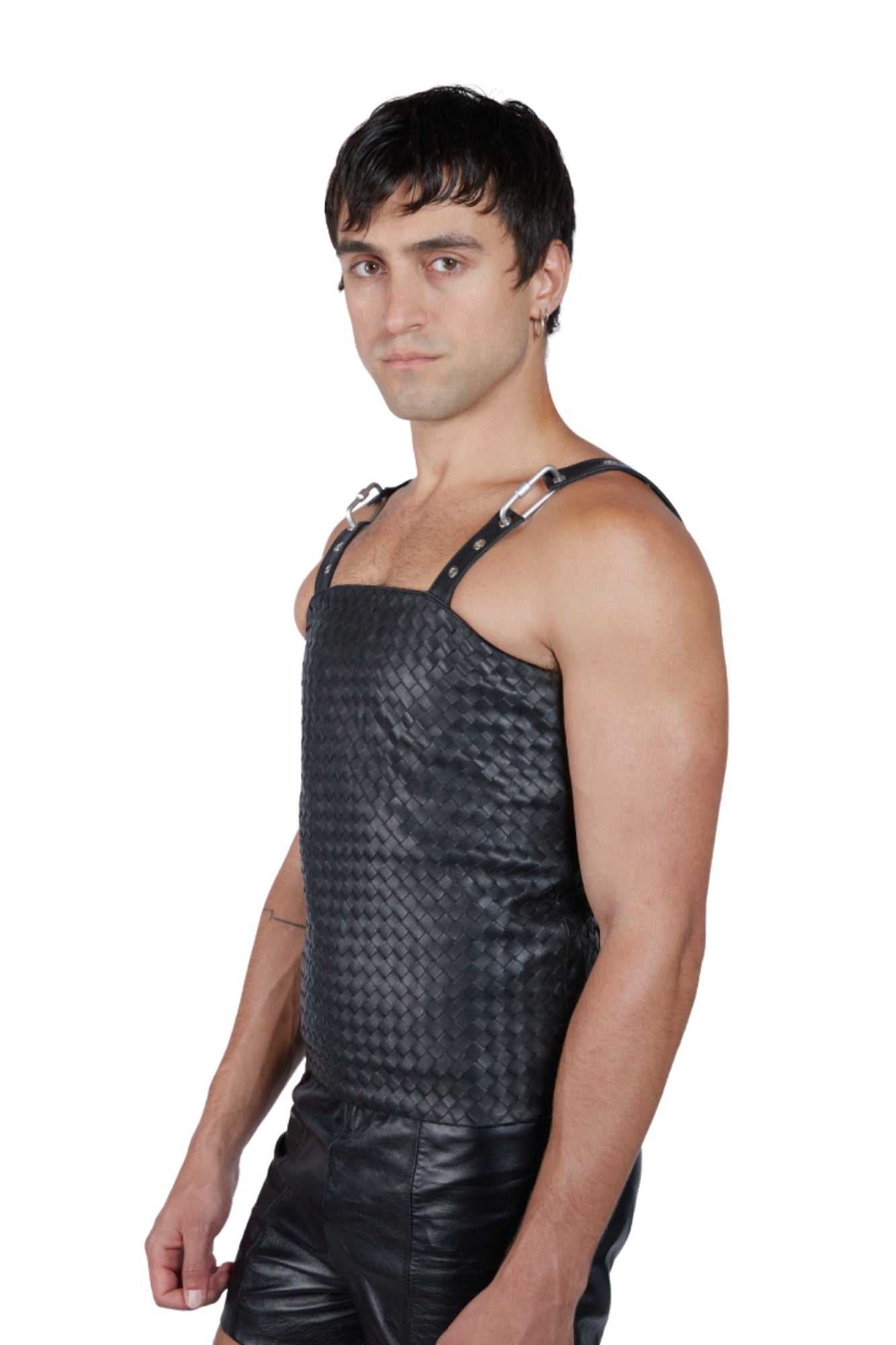 Woven leather top featuring adjustable straps and branded custom carabiner. Designed for a structured, close-to-body fit, the design blends utilitarian hardware with intricate texture.