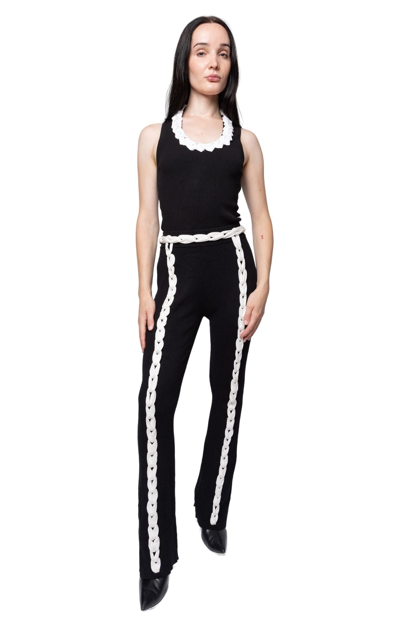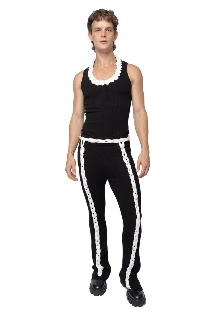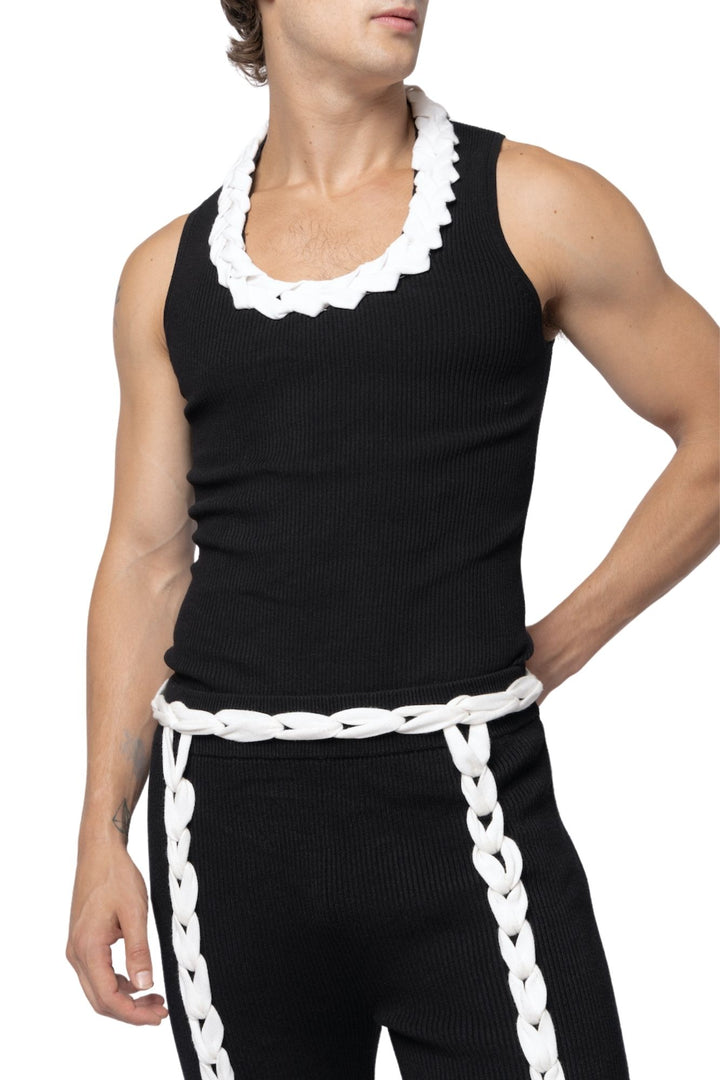 A rib-knit tank embellished with oversized, hand-knotted novelty chain stitch detailing around its scoop neckline. Featuring a close and comfortable fit.