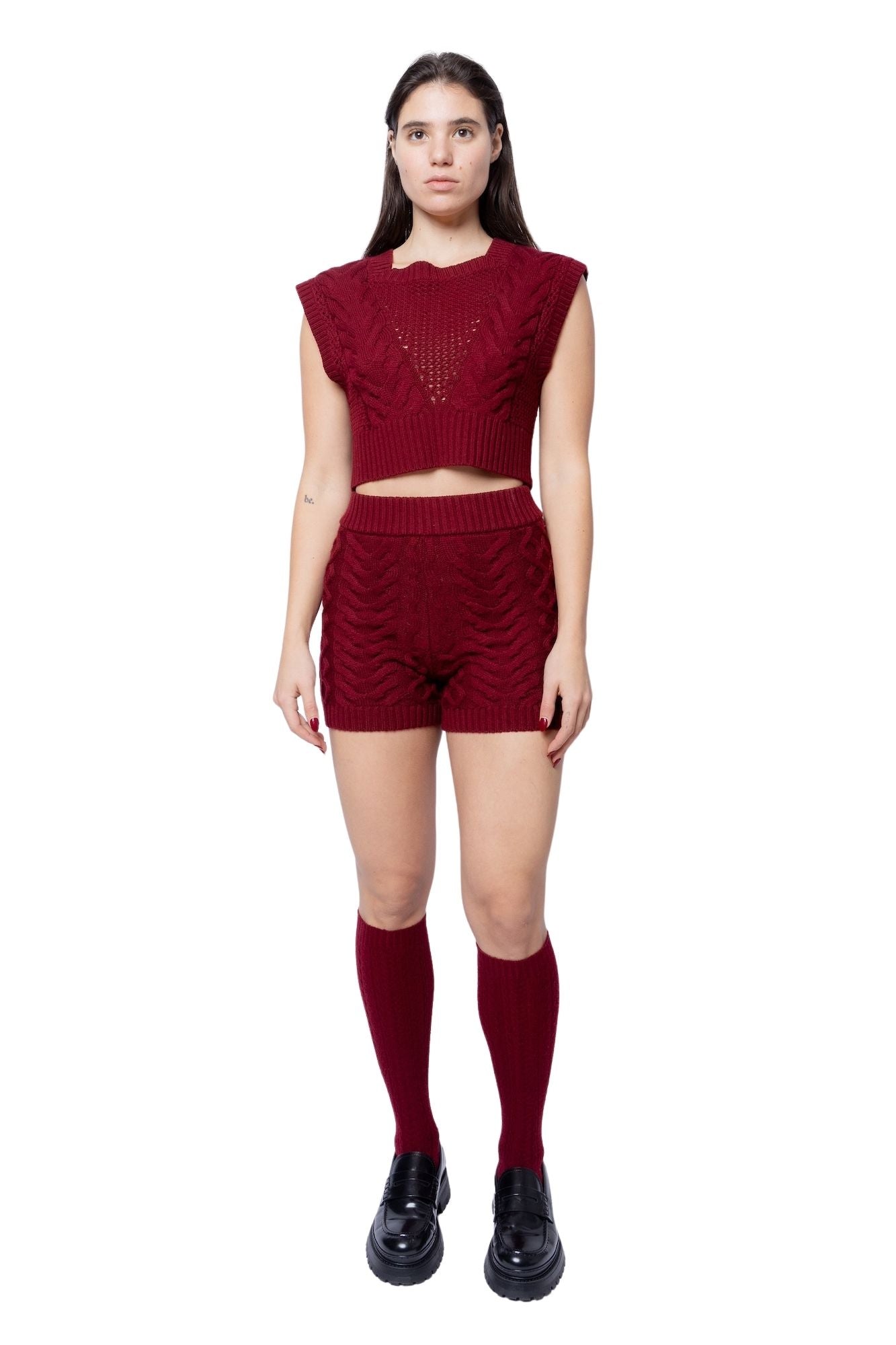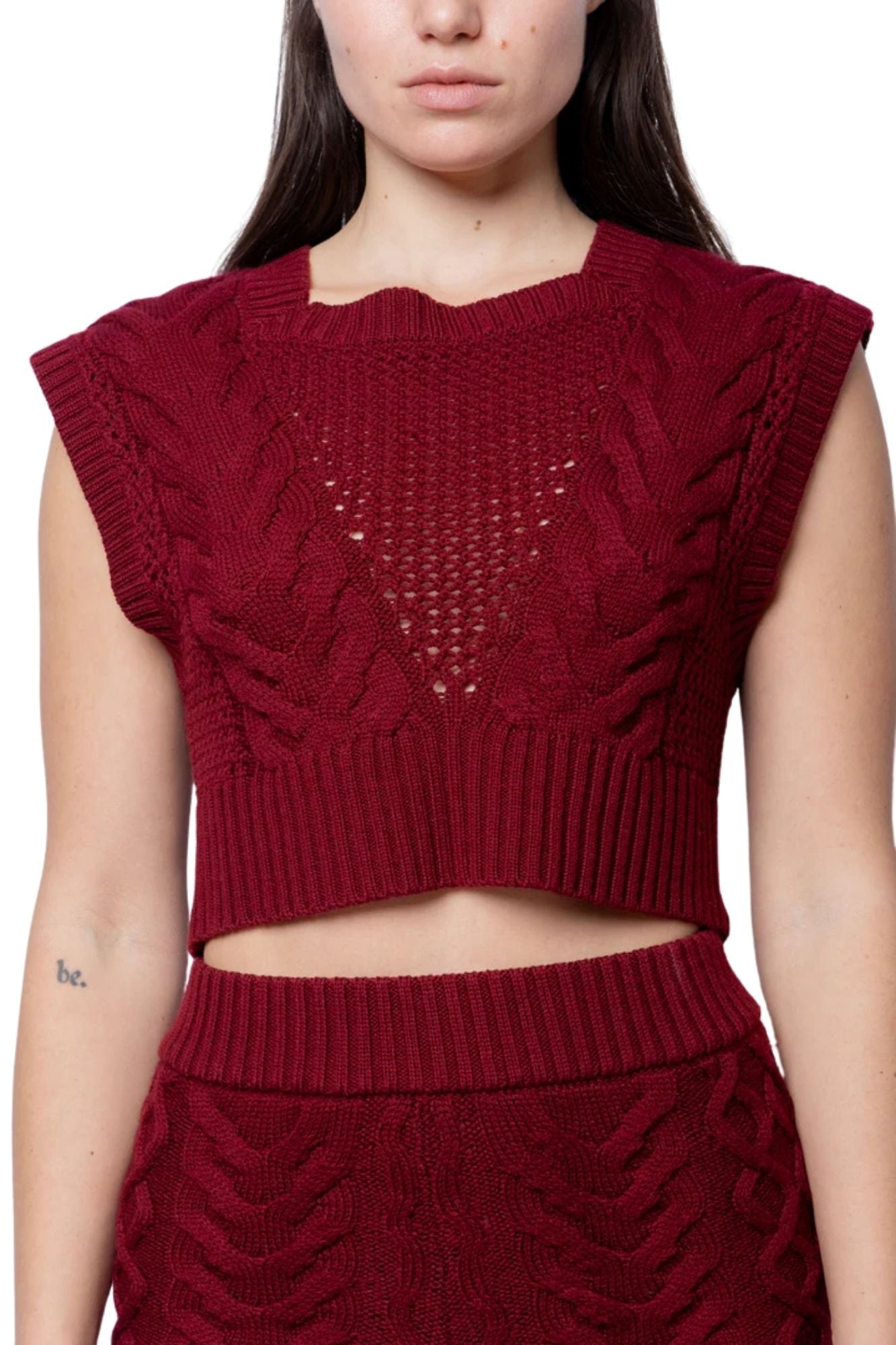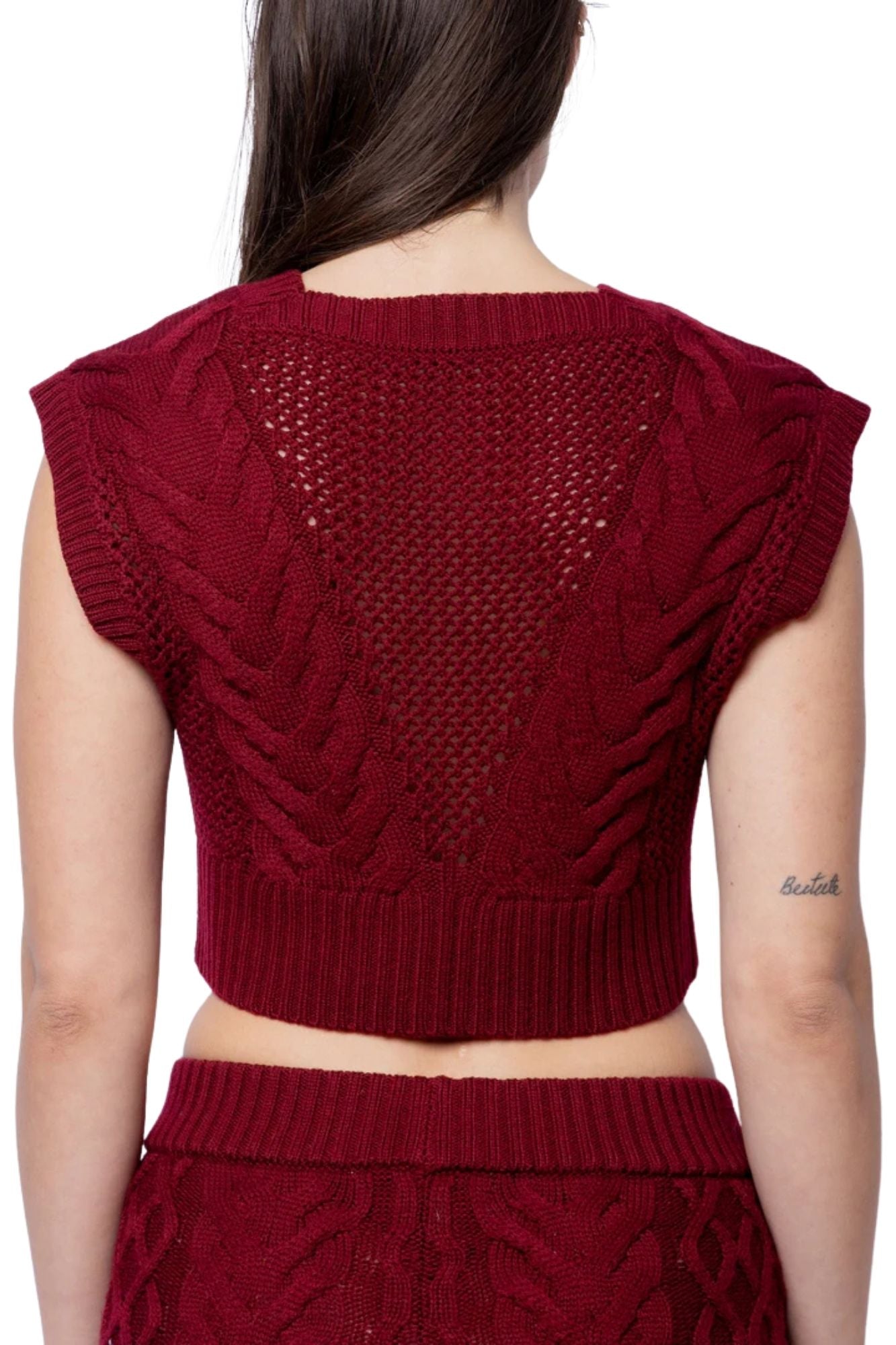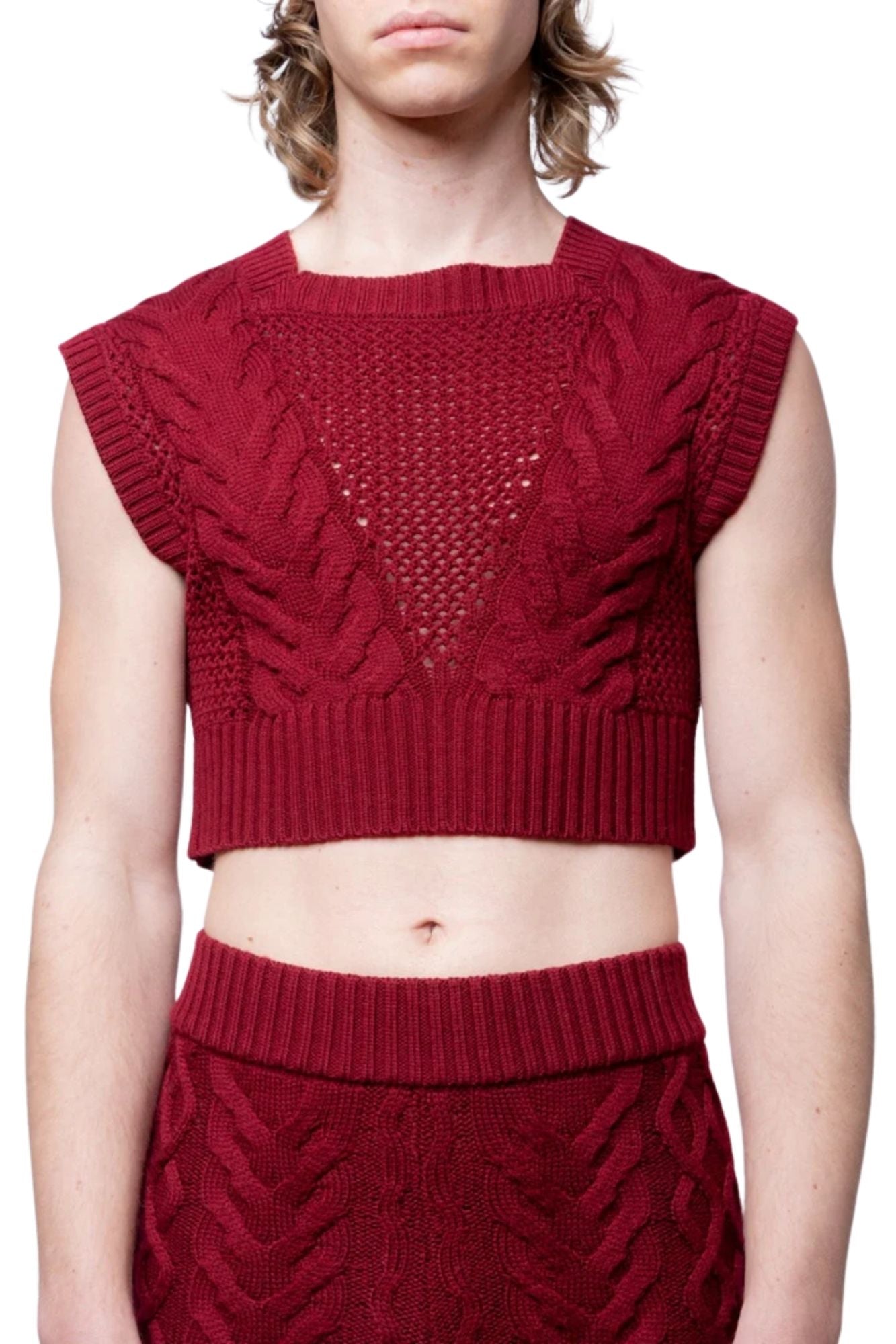 Sleeveless cropped sweater vest with ribbed trims. Featuring our signature square neck design and a blend of open-knit and cable-knit patterns. Crafted from a comfortable wool blend and for a relaxed fit.