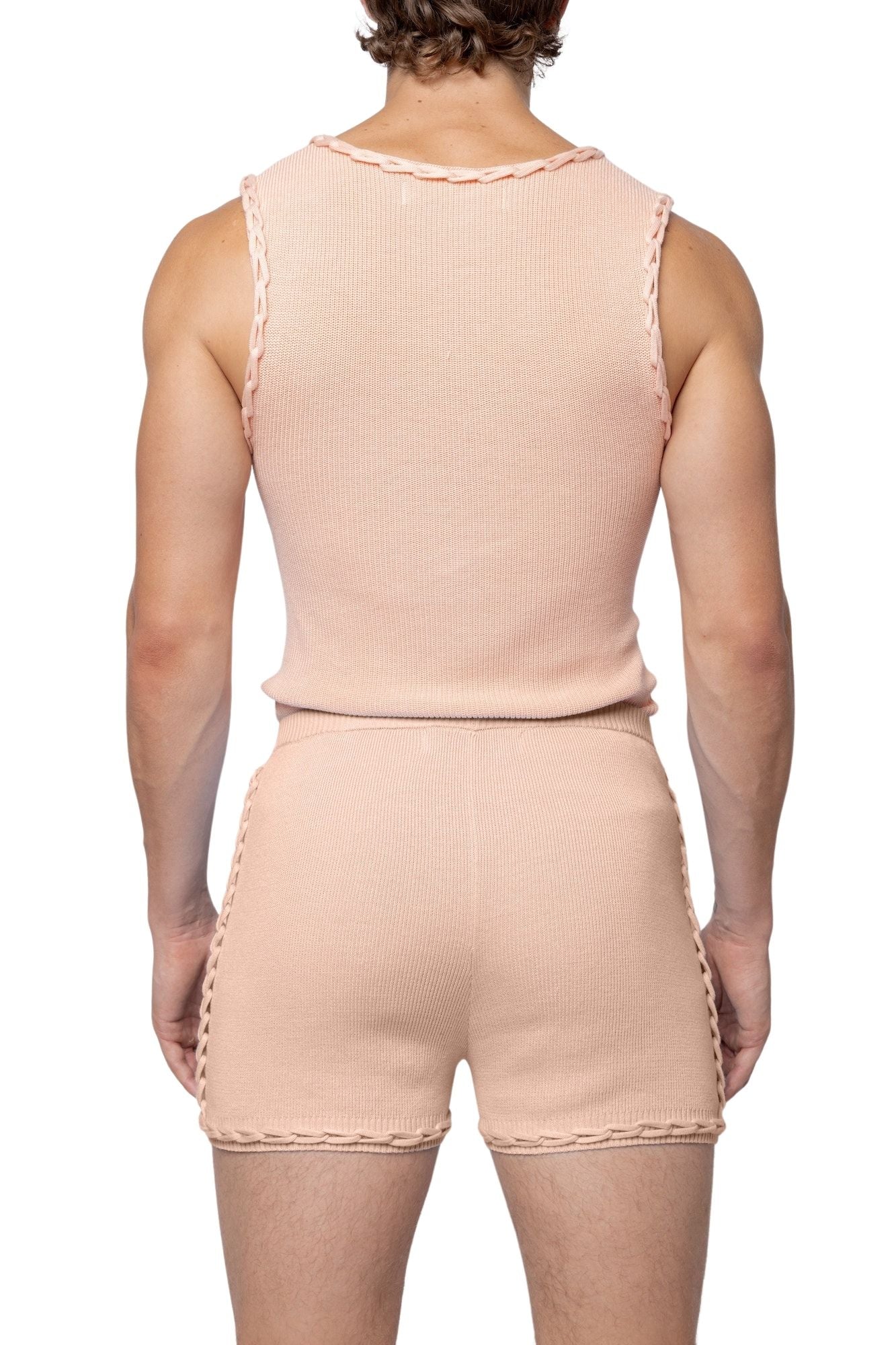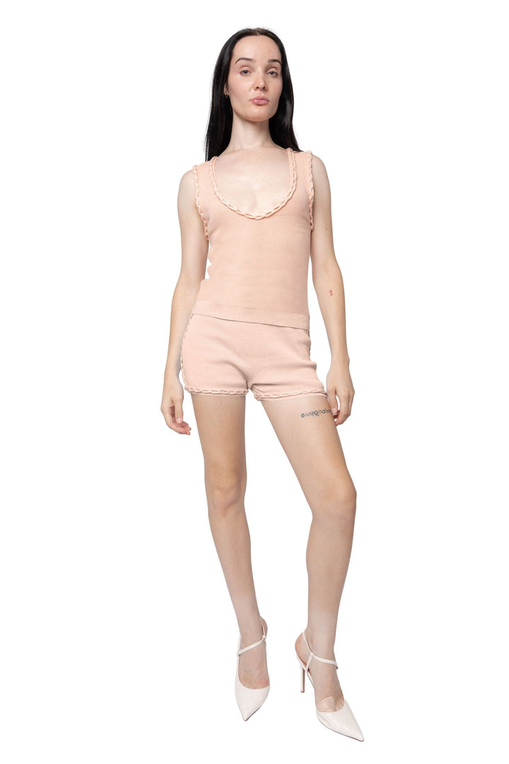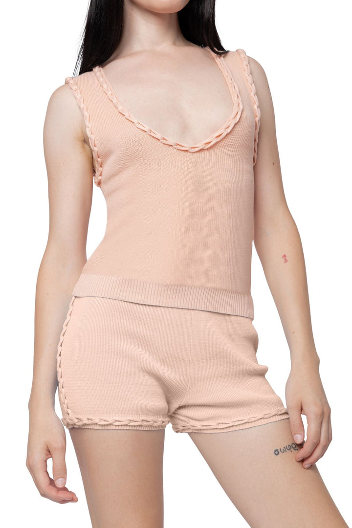 Knitted vest with plunge neckline and ribbed elastic hem. Featuring chain link detailing at neckline and armhole. Crafted in a comfortable, close-to-body fit.