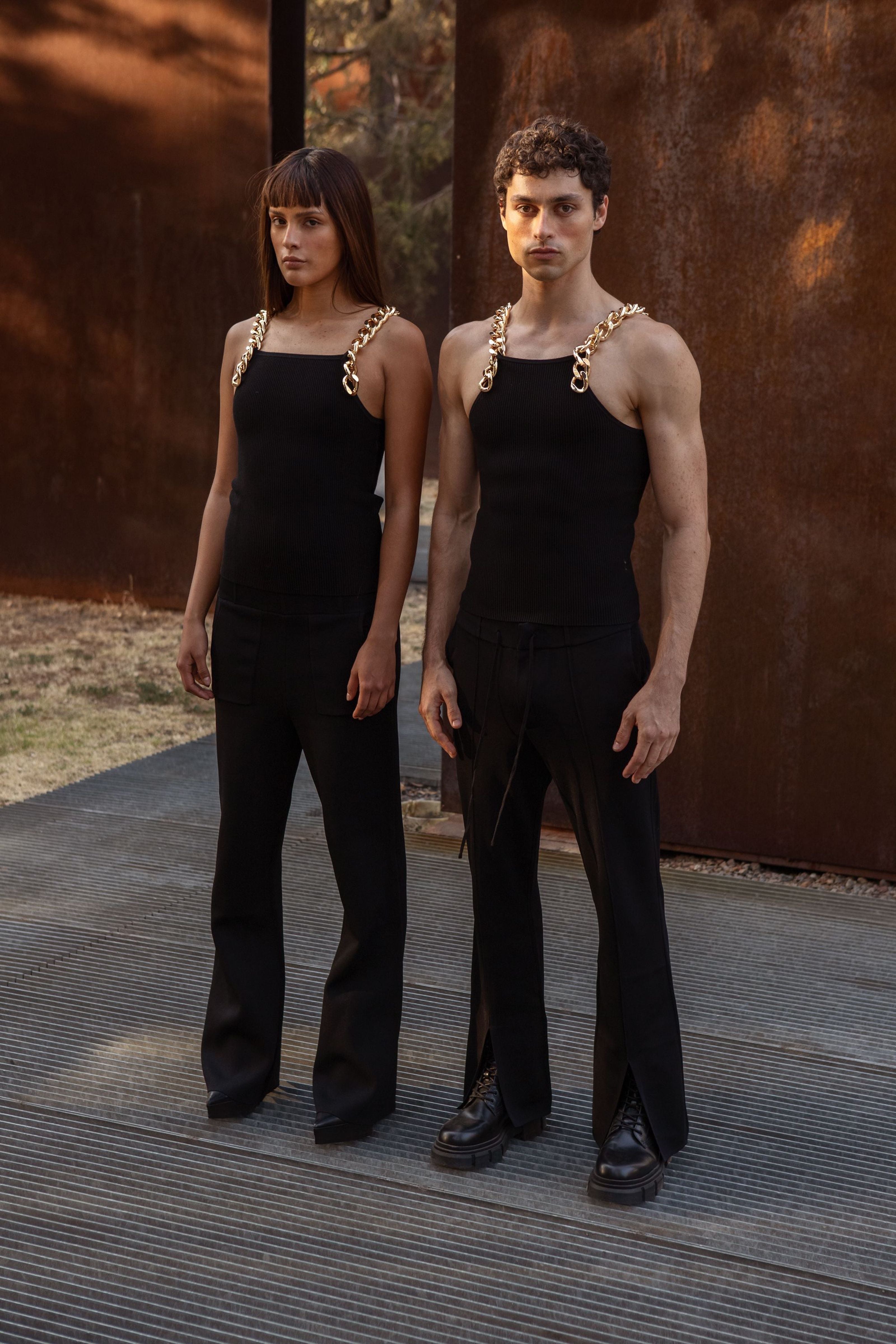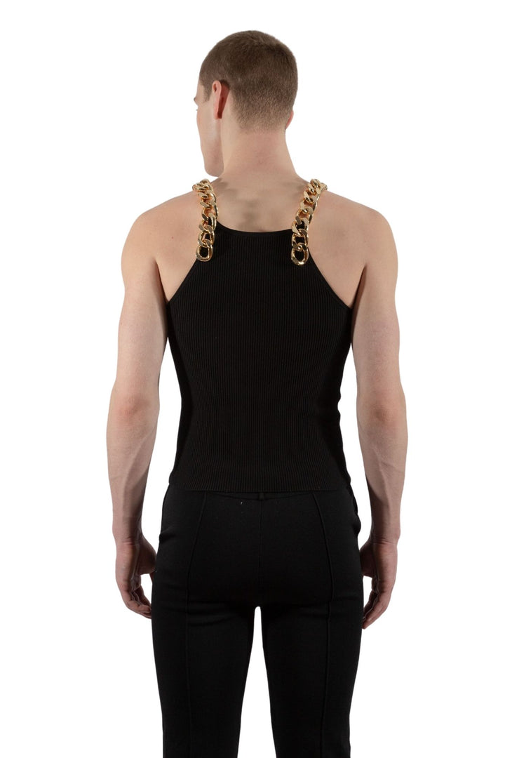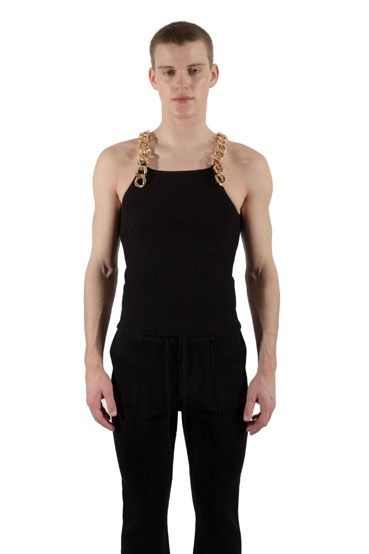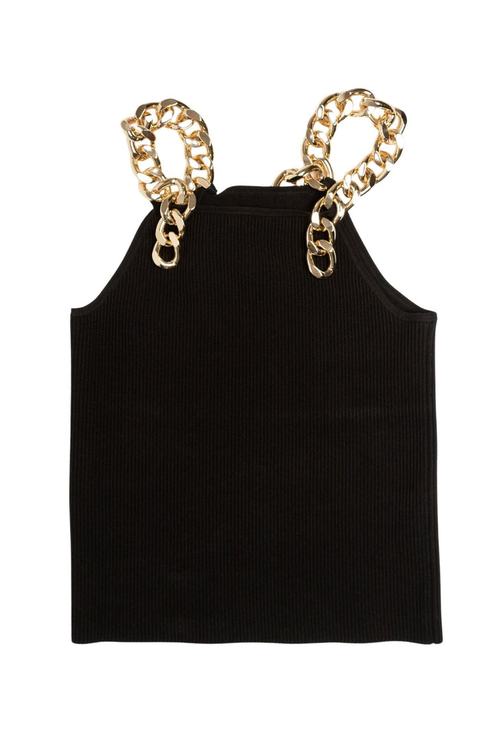Instantly recognizable with gritty, over-sized metal chain straps, connected with a soft ribbed knit body. In our signature square neck shape and a close, comfortable fit.