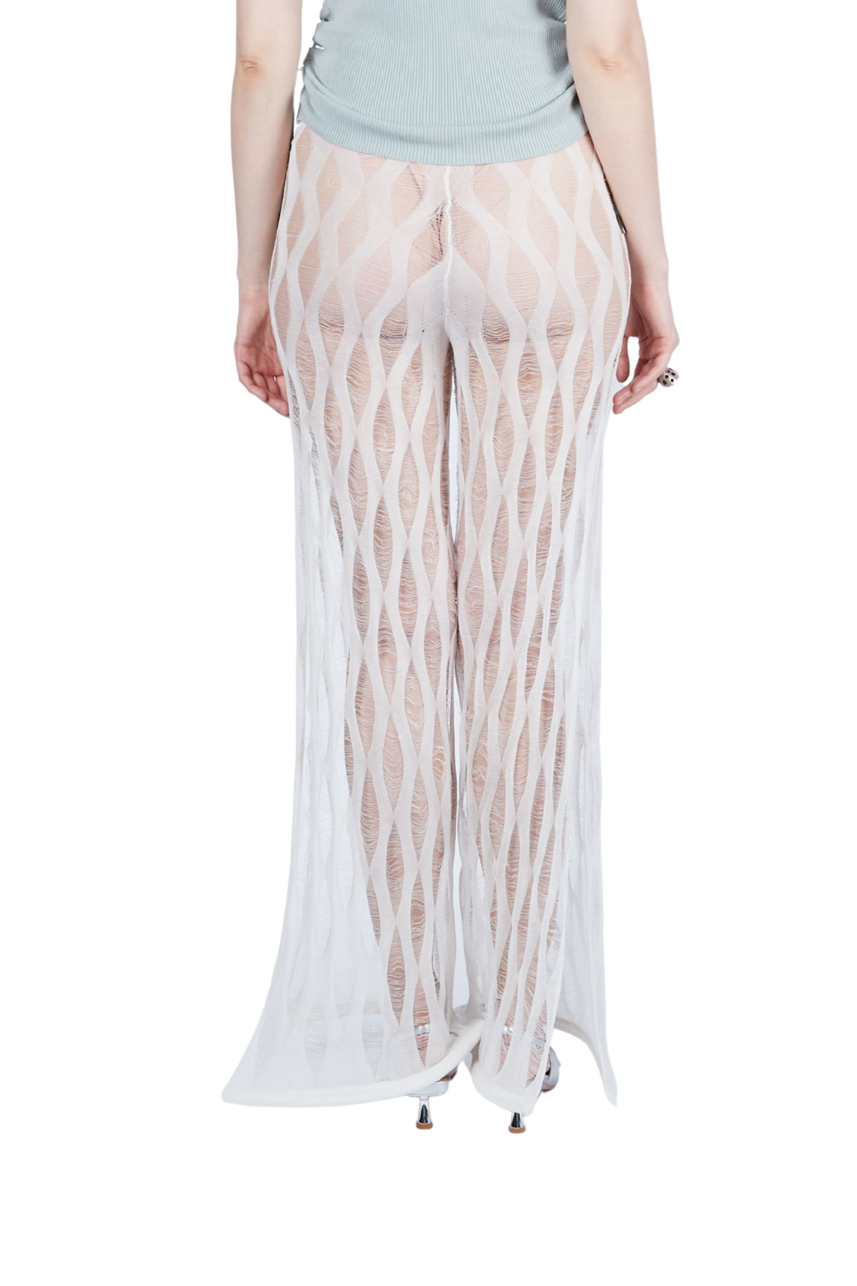 Wide-leg pants featuring a sheer diamond ladder-stitch. Designed for a close-to-body fit and with long side slits for movement.