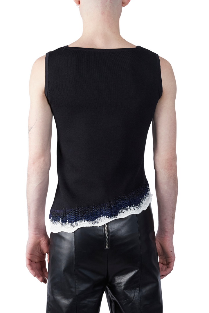Knit tank top detailed with an embroidered hem. Embroidery detailing creates a highly textured and gradient multi-color pattern. Designed with our signature square neck line and a close to body fit.