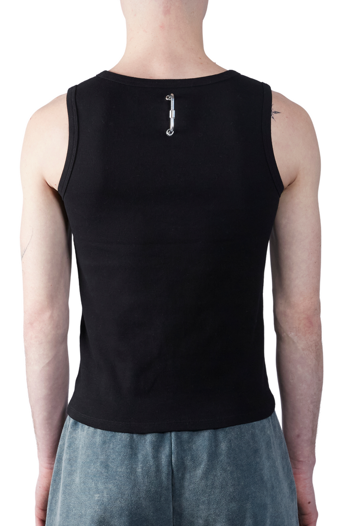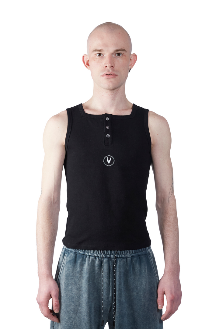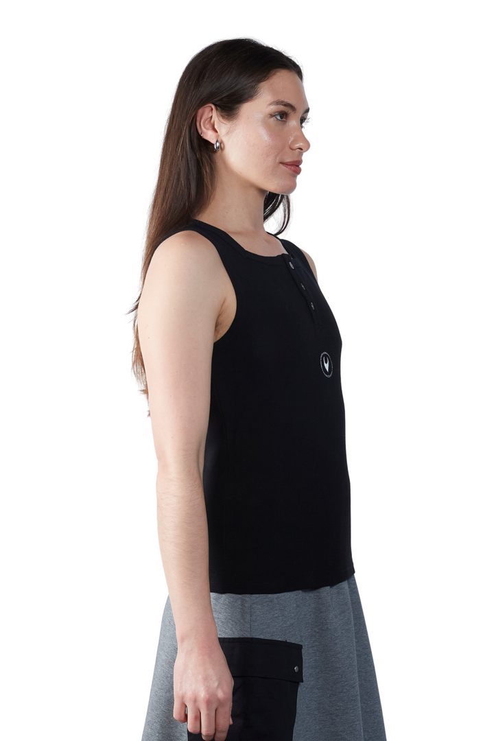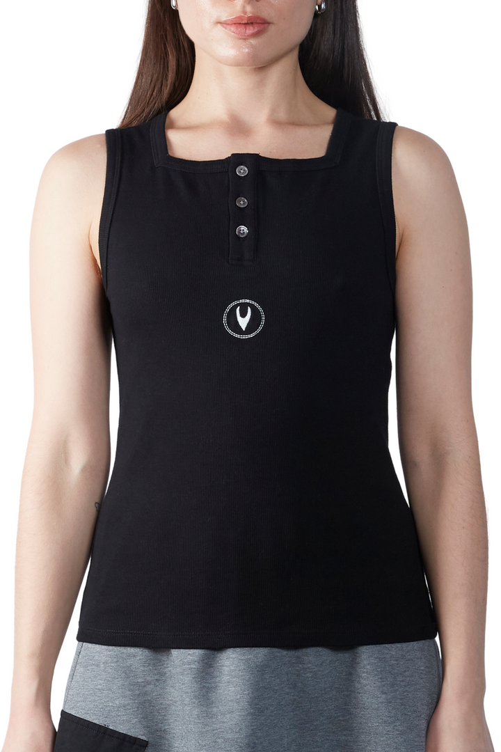 Our take on the classic tank top featuring button up detailing and our logo embroidery at the center front. Designed with a square neckline and close to body fit.