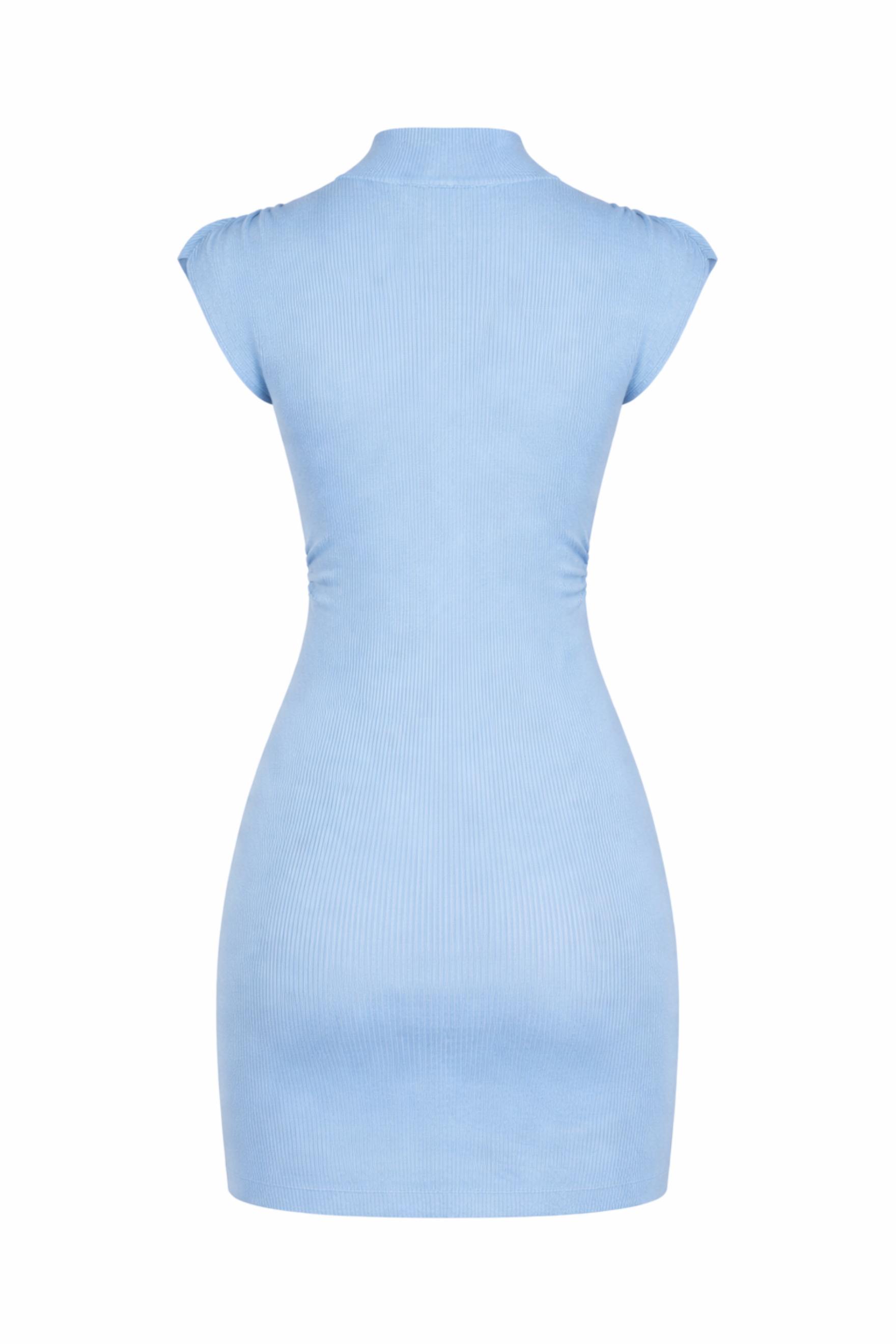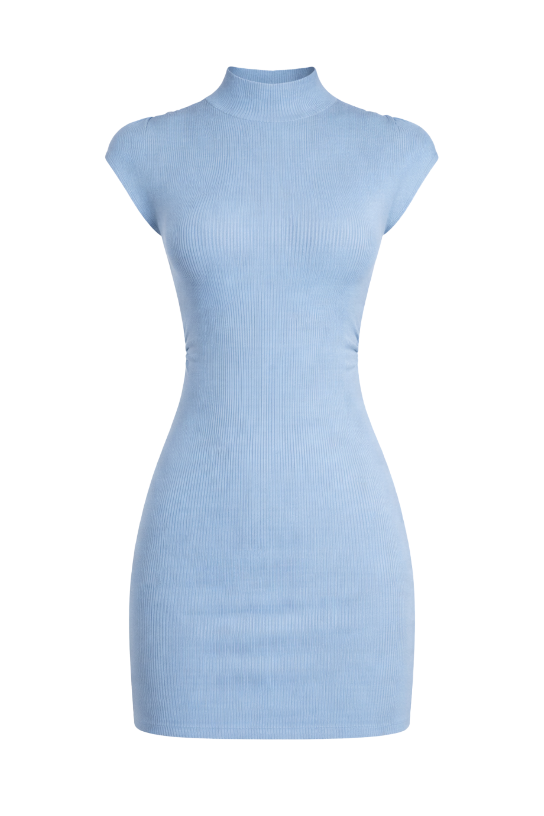 Ruched broad-shoulder sleeveless dress with a mock neckline and a smooth, sculpted shoulder line. Asymmetric side ruching defines the waist and hips while adding flexible comfort.