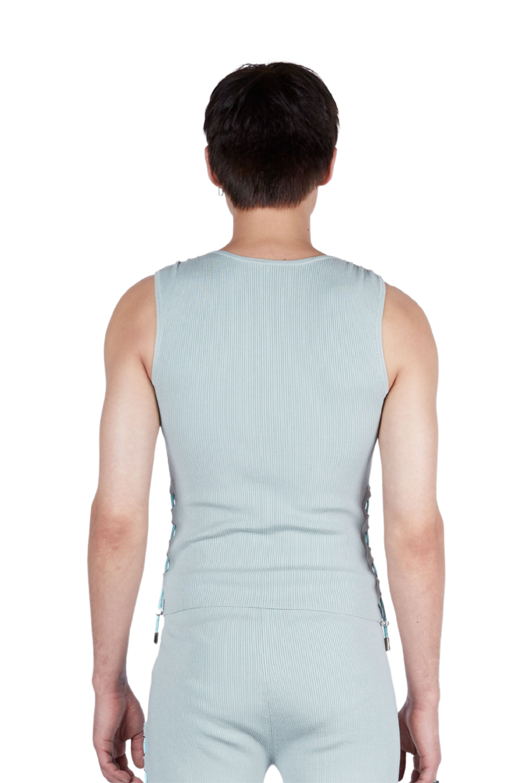 A sleeveless, ribbed V-neck top with a clean wrap-style front and a body-skimming fit. Side ruching with adjustable drawstrings lets you customize the length and shape for a softly draped silhouette.