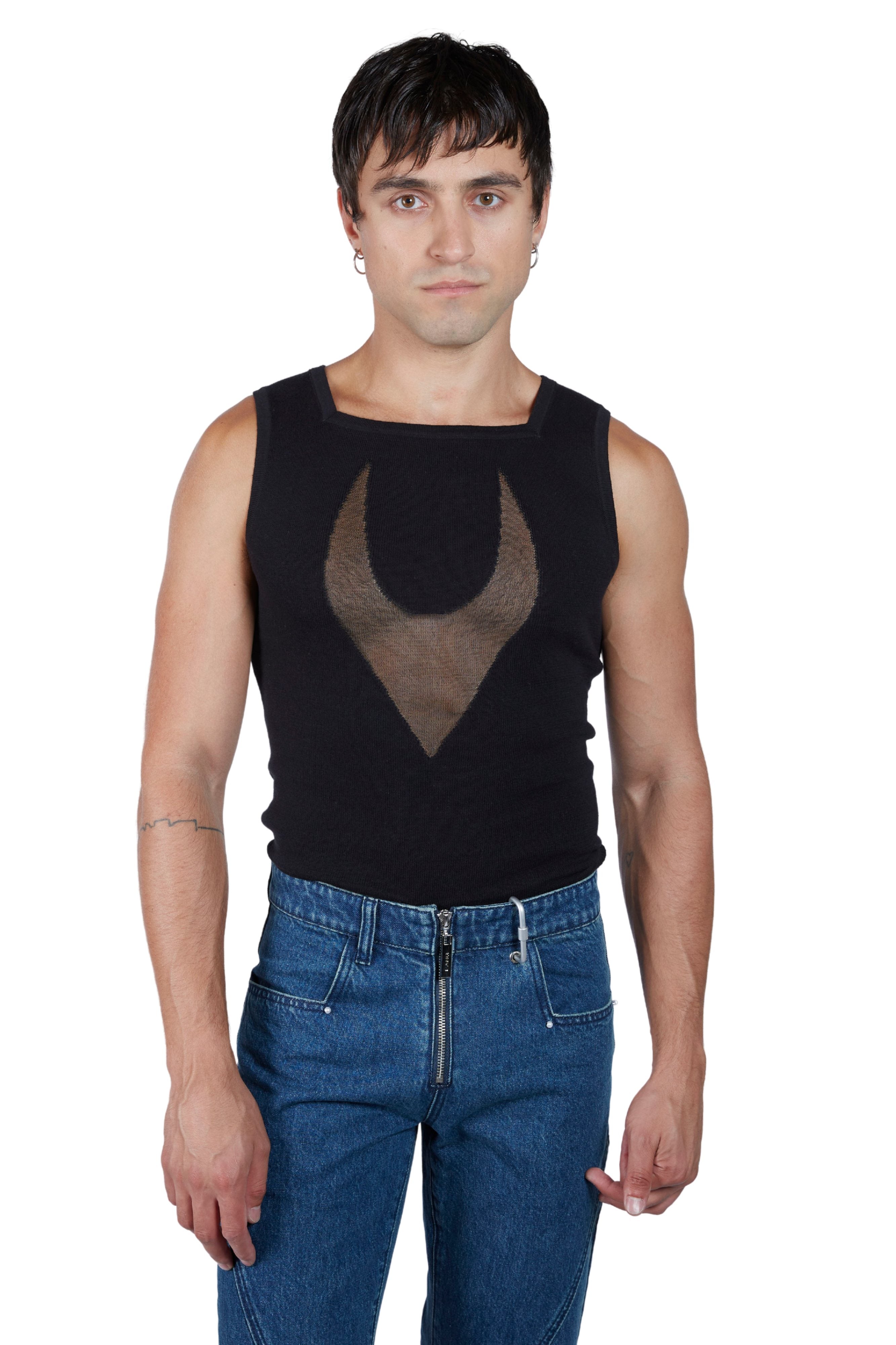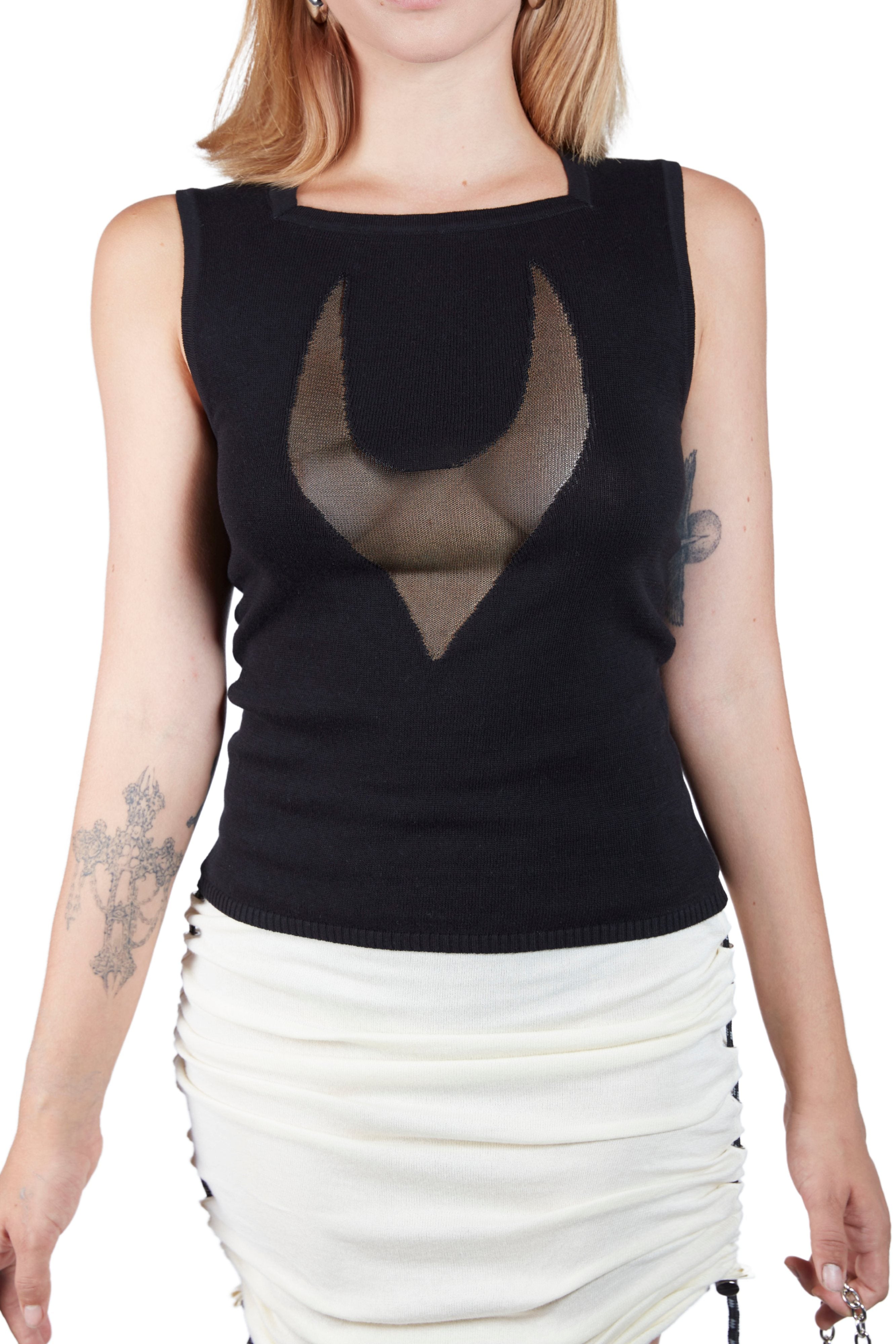 Lightweight knitted top with sheer graphic FANG motif at center front, achieved using the intarsia technique. Designed for a close-to-body fit with an at-hip length and our signature square neckline.