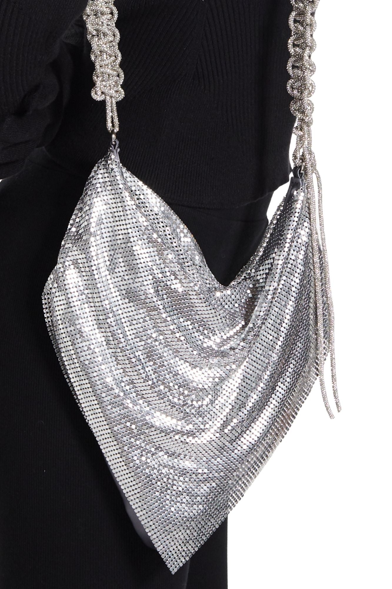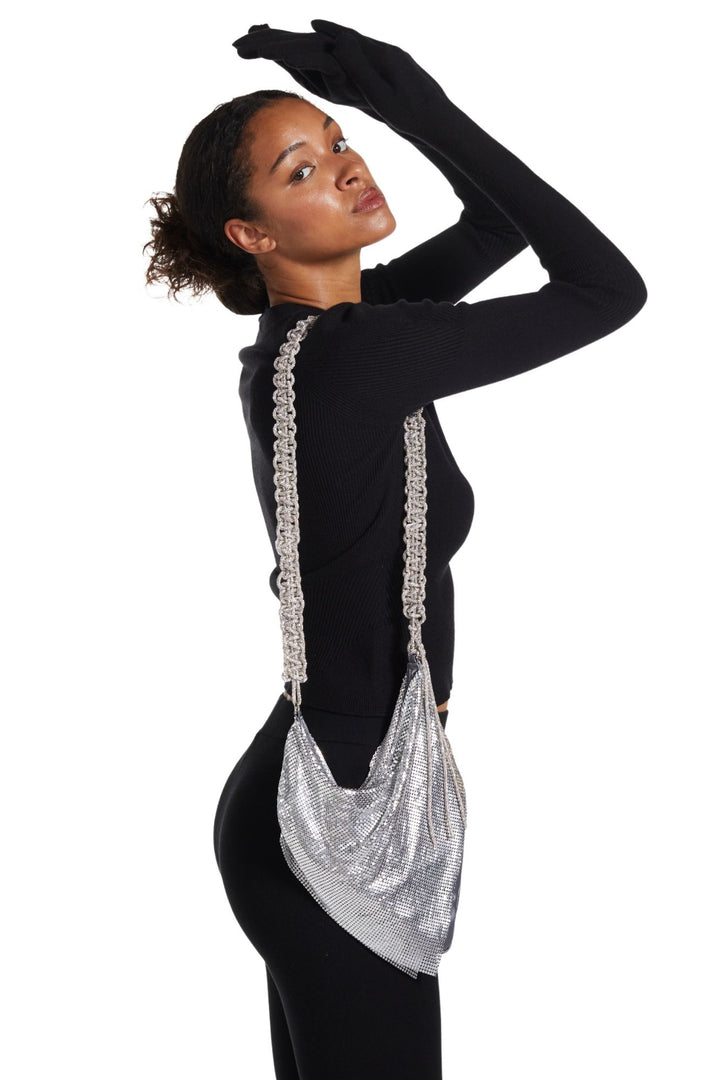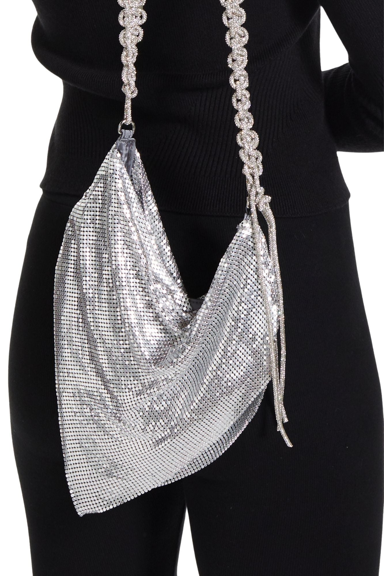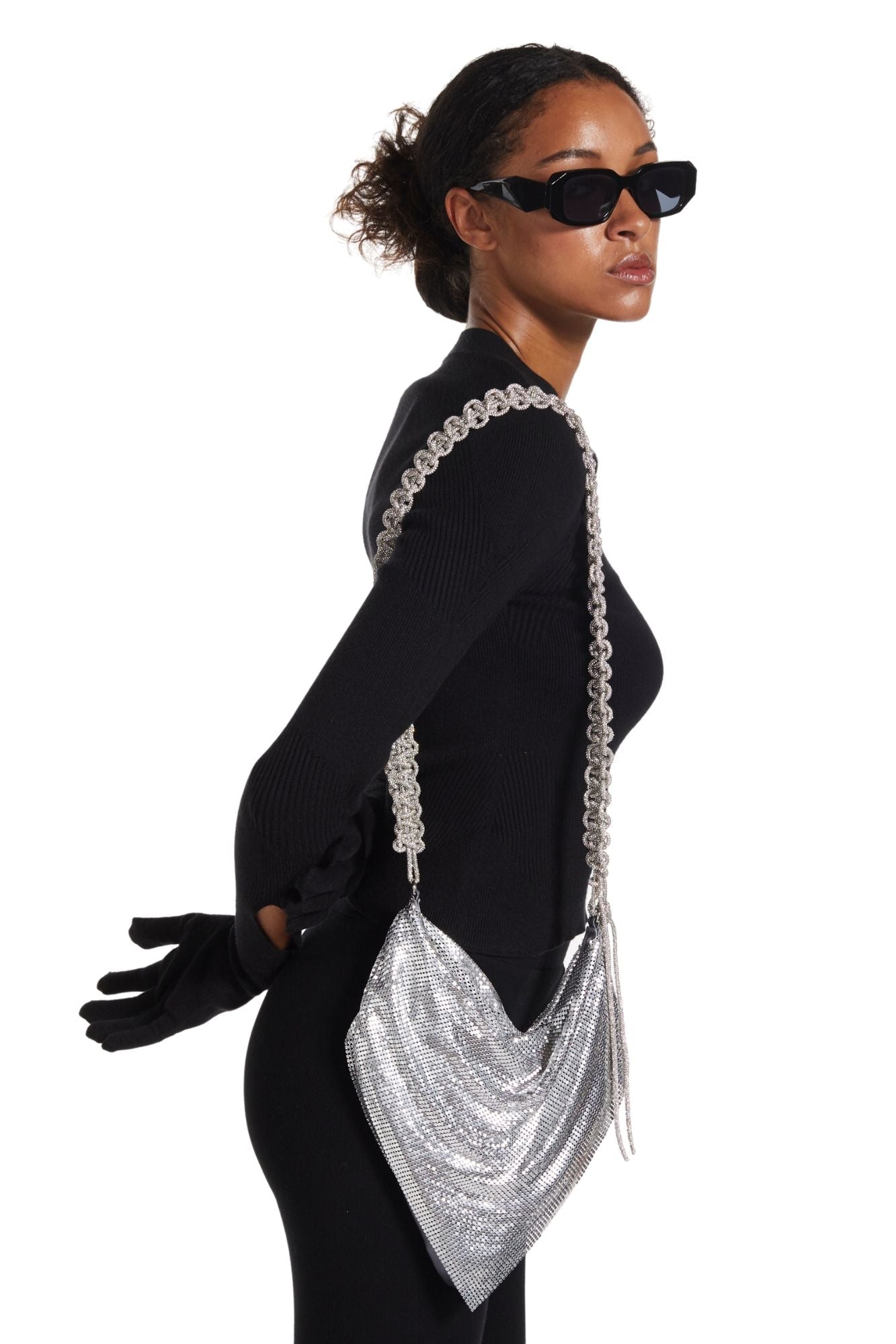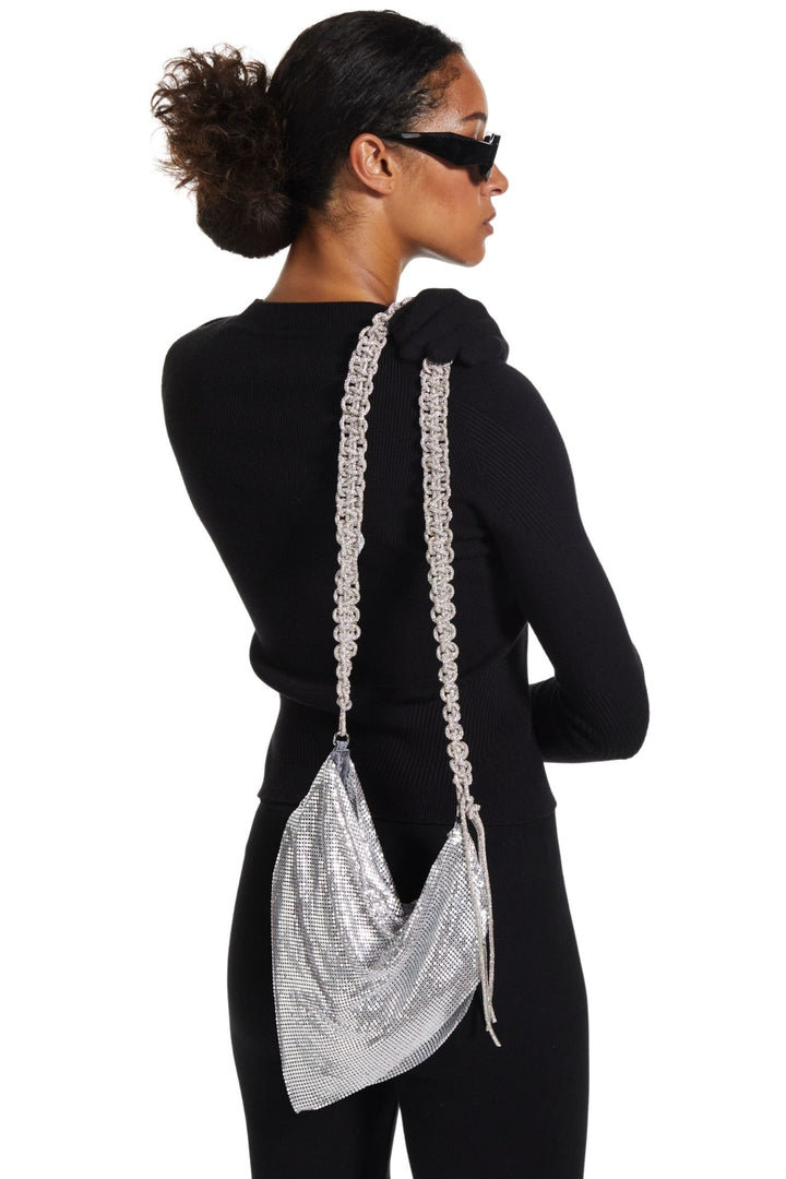 Taking its shape from our graphic logo, this shoulder bag is an eye-catching work of art featuring a braided rhinestone strap and a glittering chainmail self. A voluminous inner pouch is cleverly sandwiched between its drapey shell with interior pockets and magnetic snap closure.