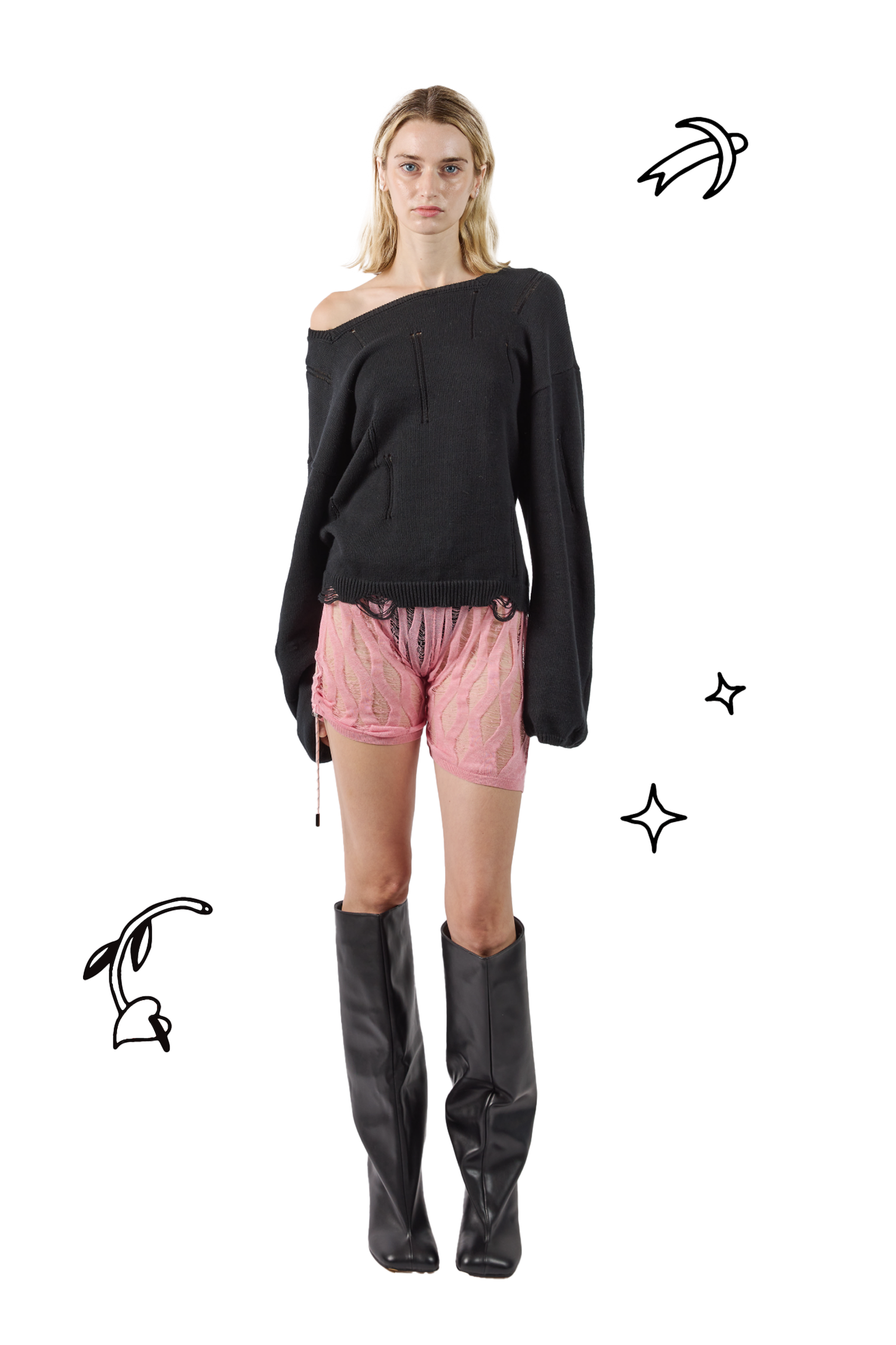 Diamond ladder stitch knit shorts featuring a grommet fastening on the side for an adjustable length. Designed for a close to body fit. Easy layering.