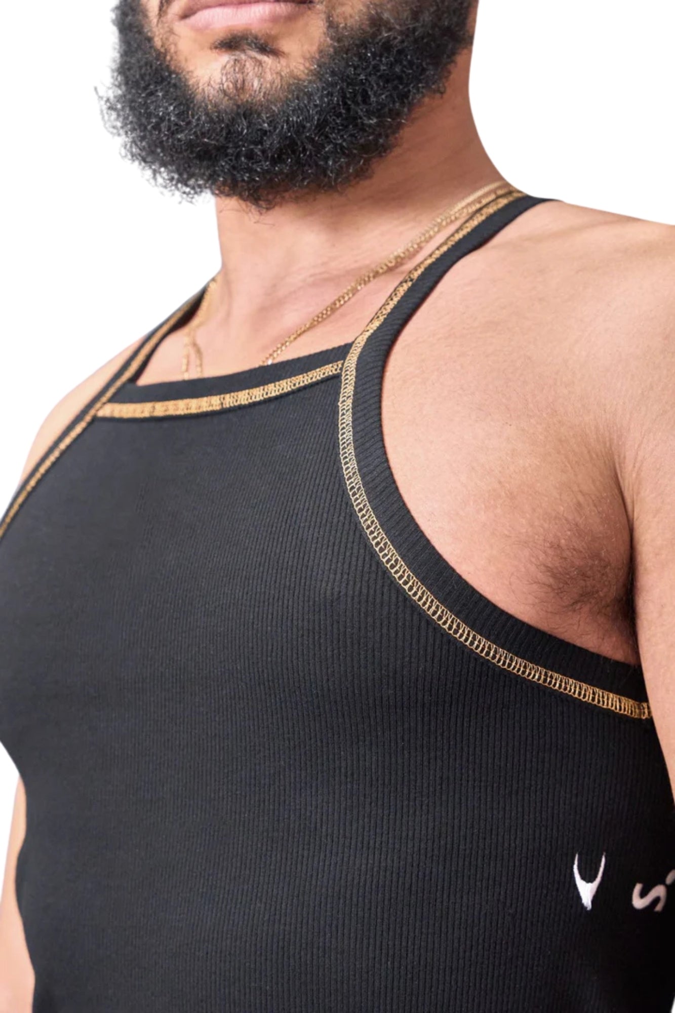 Contemporary take on the classic ribbed tank with a square neckline that nods to activewear silhouettes like the singlet. Sewn with gold exterior thread and logos embroidered under sleeve opening. Cut at hip.