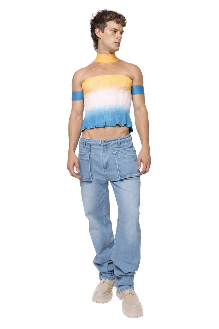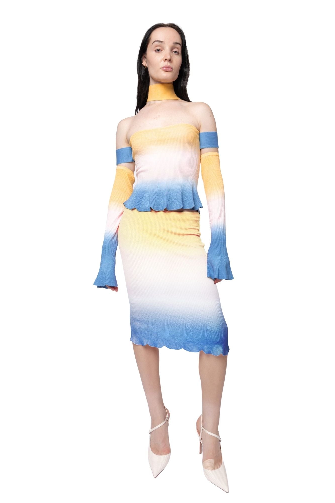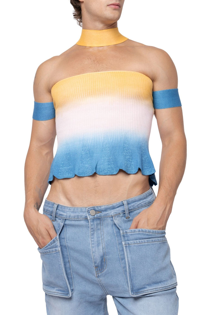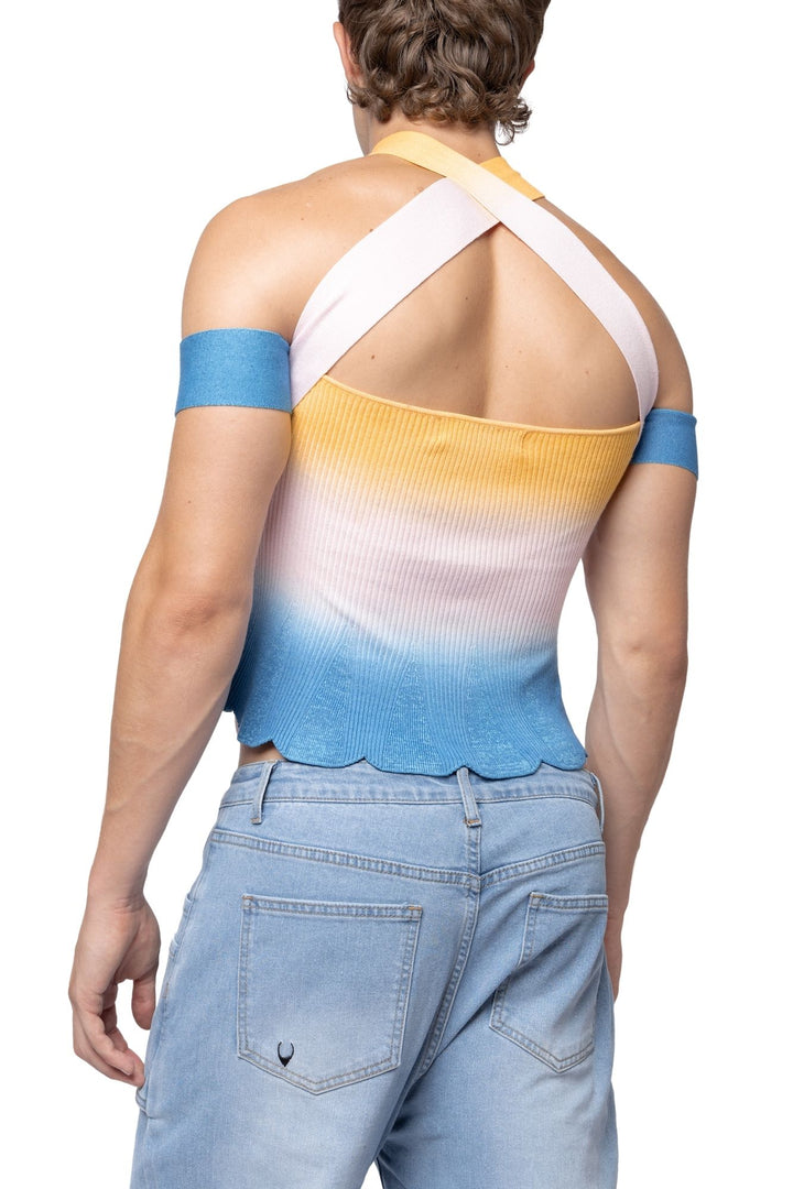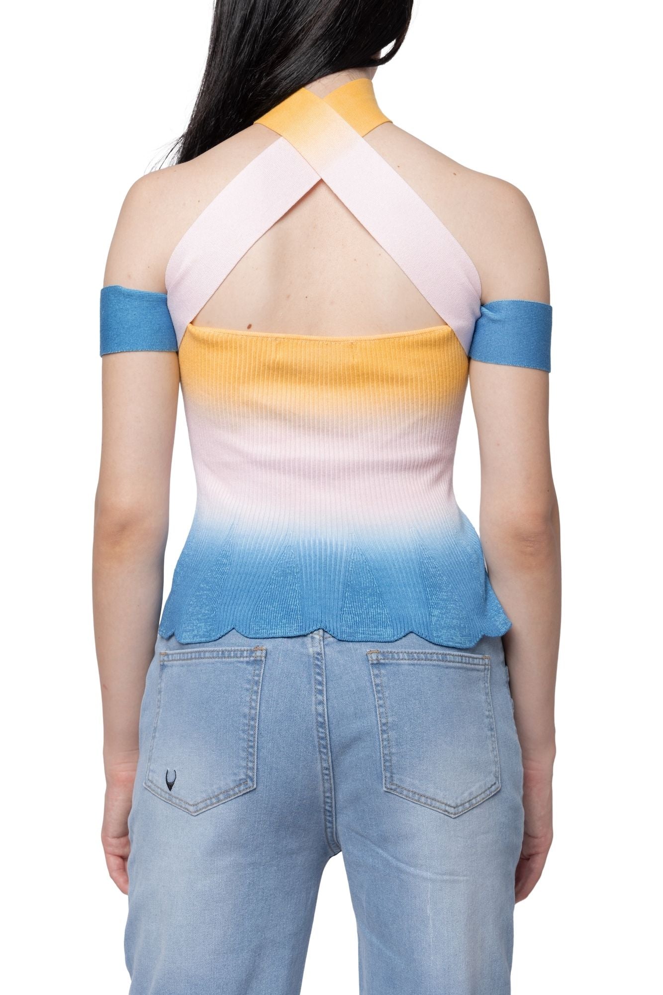 Ribbed top with bi-cep straps and choker neck that extends to form criss-cross back straps. Bottom opening features shell-like, wavy pleated hemline. Gradient colors throughout body create an iridescent effect. Knitted in a comfortable, next-to-skin fit. Pullover entry.