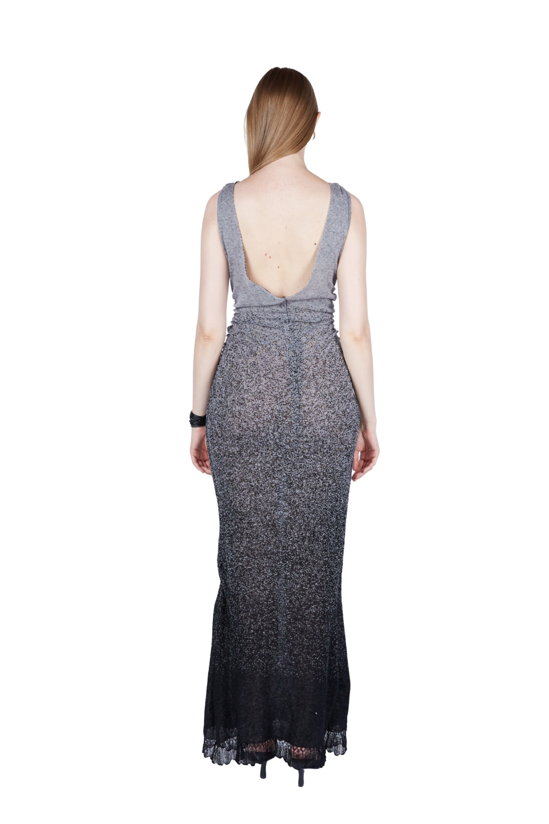 Maxi dress designed with a clean sleeveless neckline and a close-to-body silhouette. The intarsia technique creates the gradient fade, while subtle side ruching creates shape and flexible comfort. Designed with a custom knit lace trim and open scoop back.