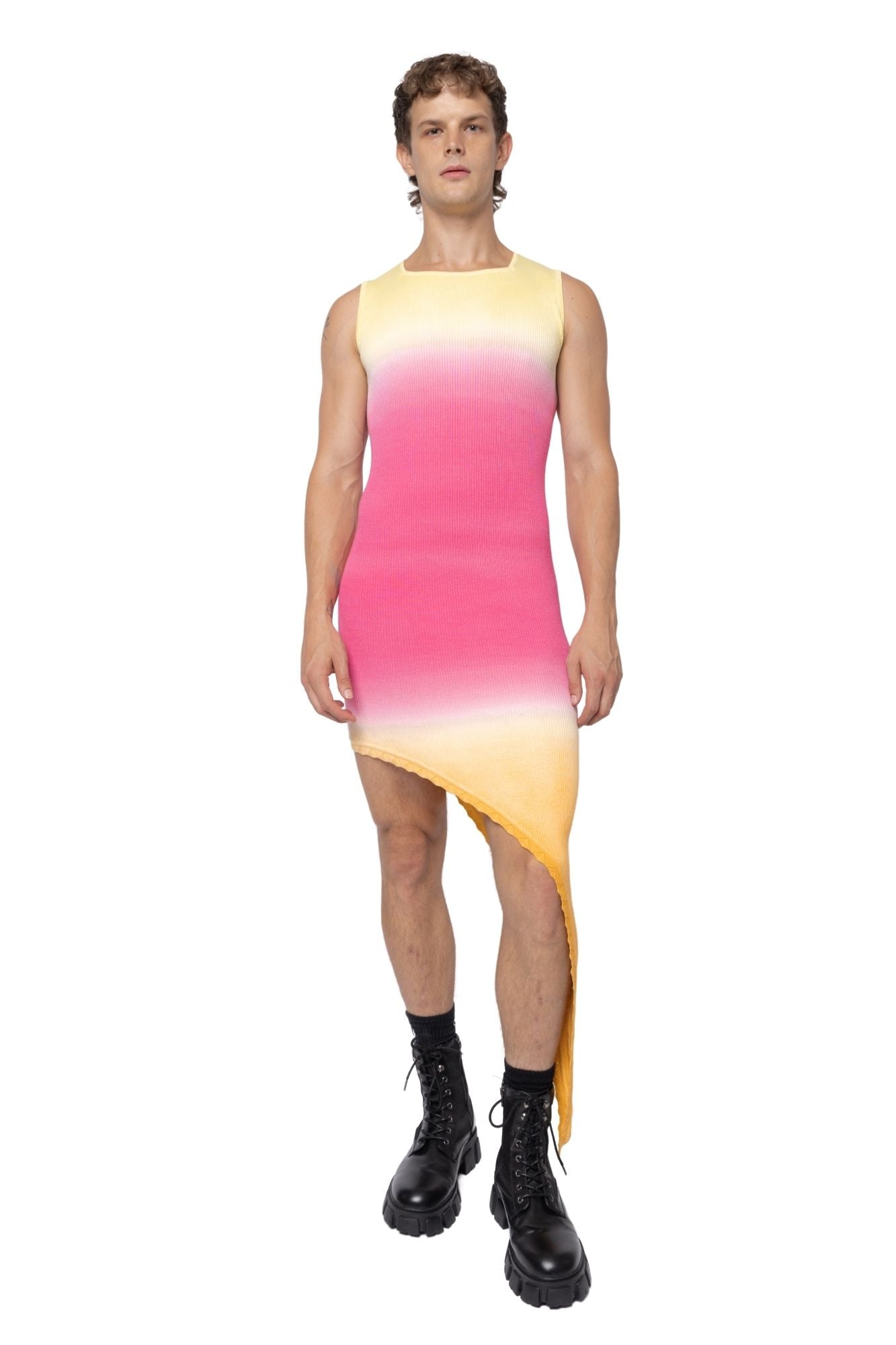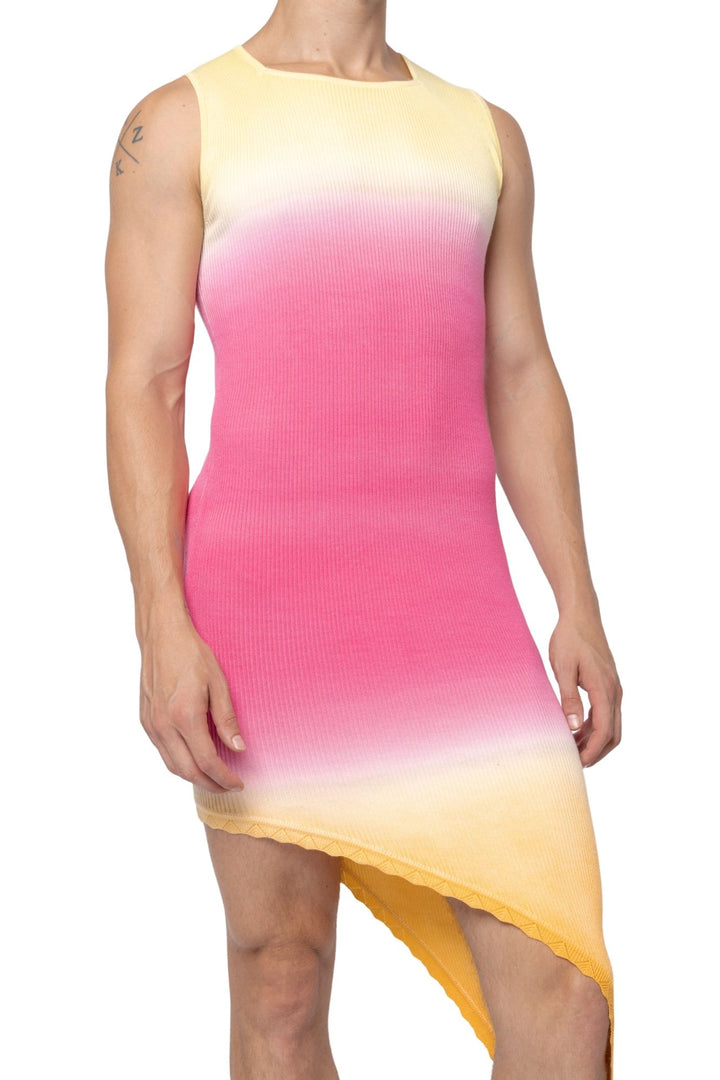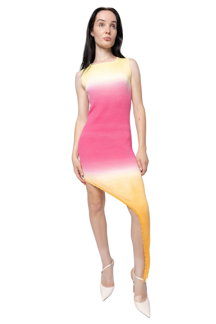 Ribbed dress featuring square neckline and asymmetrical high-low hemline with shell-like, wavy fashioning. Gradient colors throughout body create an iridescent effect. Knitted in a comfortable, next-to-skin fit.