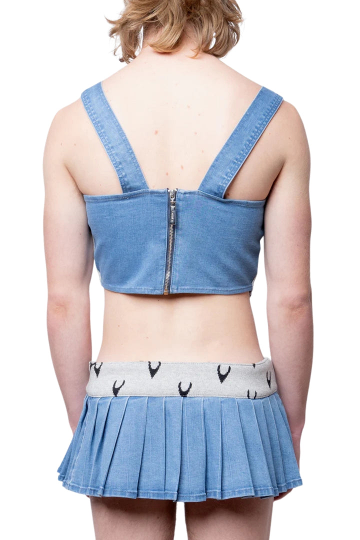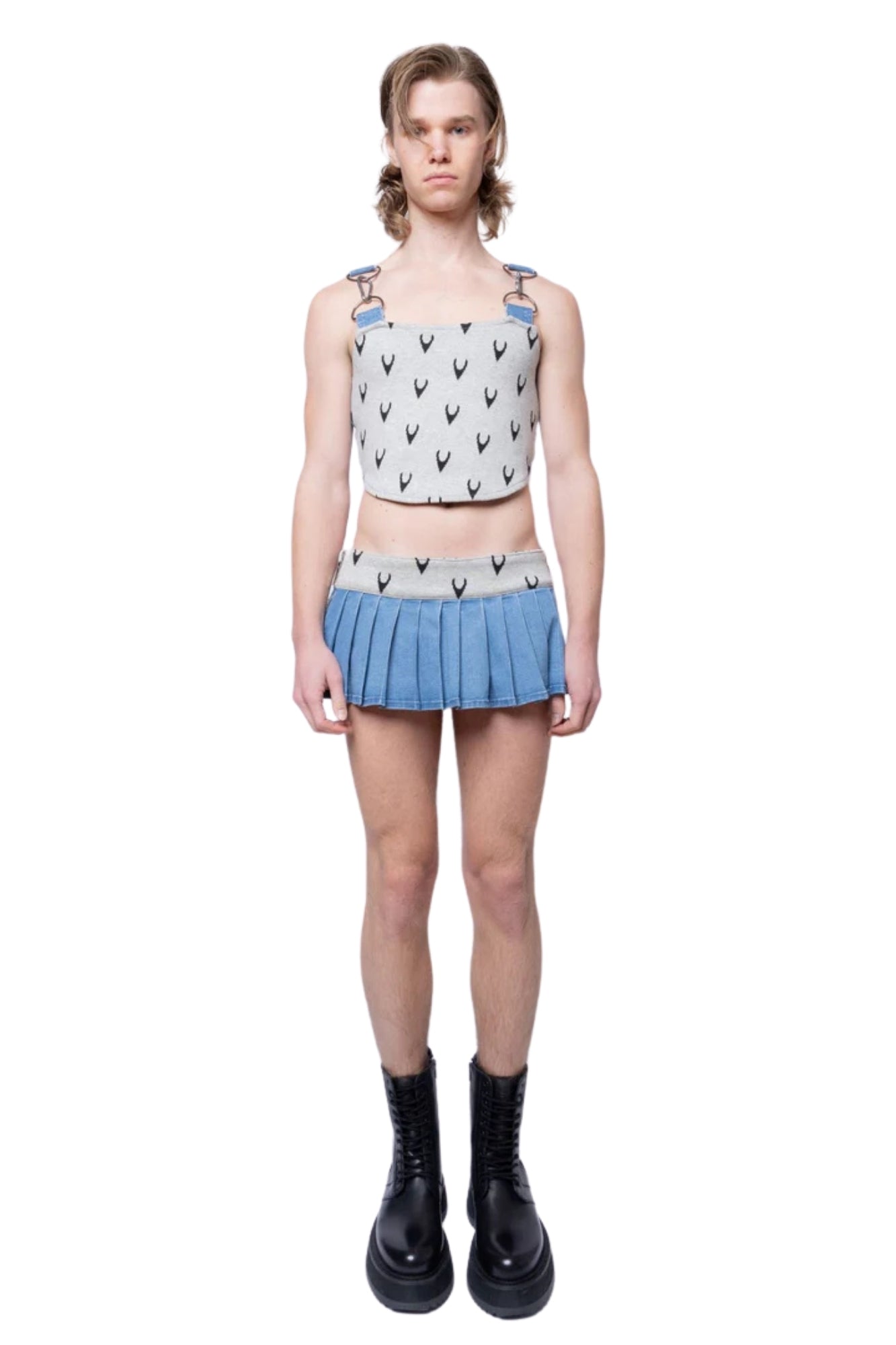 Mini skirt designed with jacquard knit monogram waistband contrasted with denim pleats. Featuring a logo zipper at side body for easy wear.
