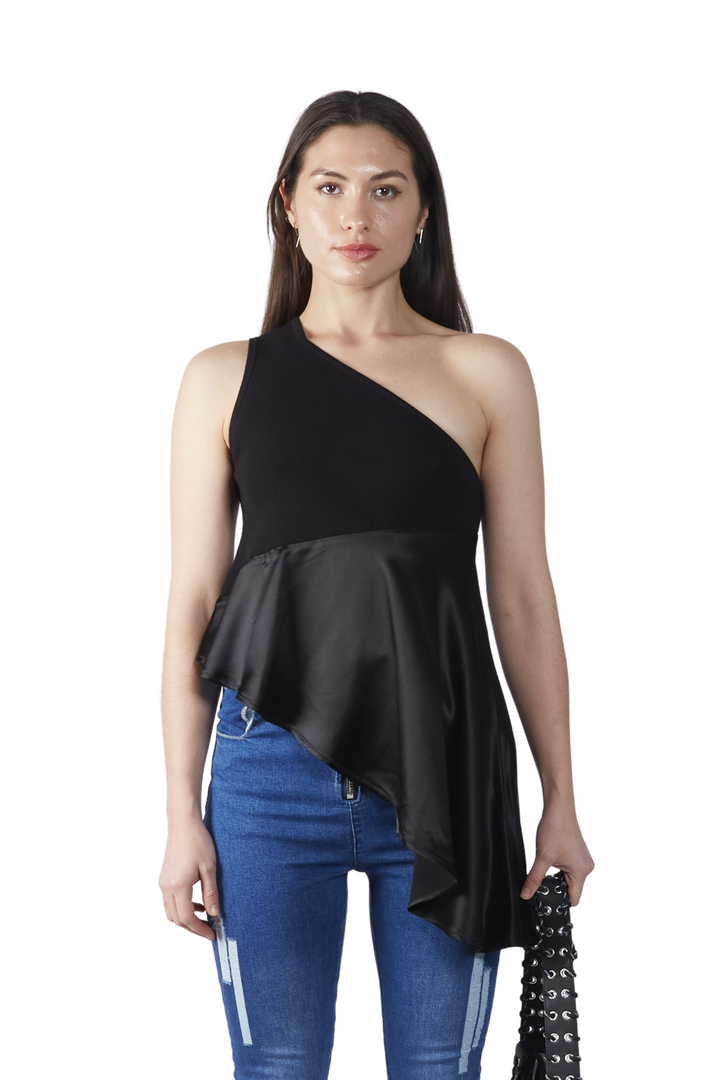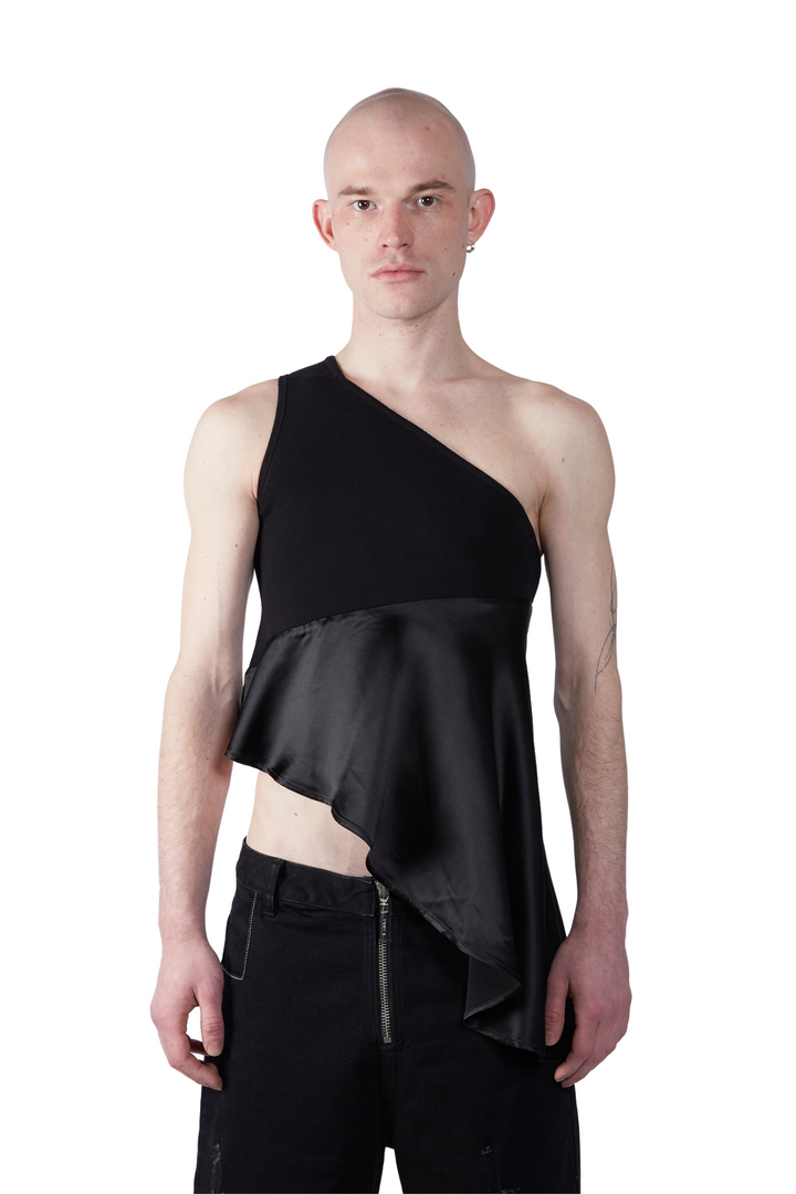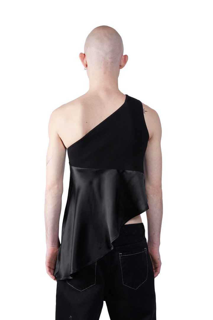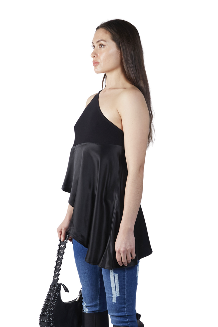 Asymmetrical top blending soft knit and draping satin. Soft knitwear supports the body of the garment featuring a one shoulder strap. Lustrous satin juxtaposes at the bottom for comfort and is cut diagonally.