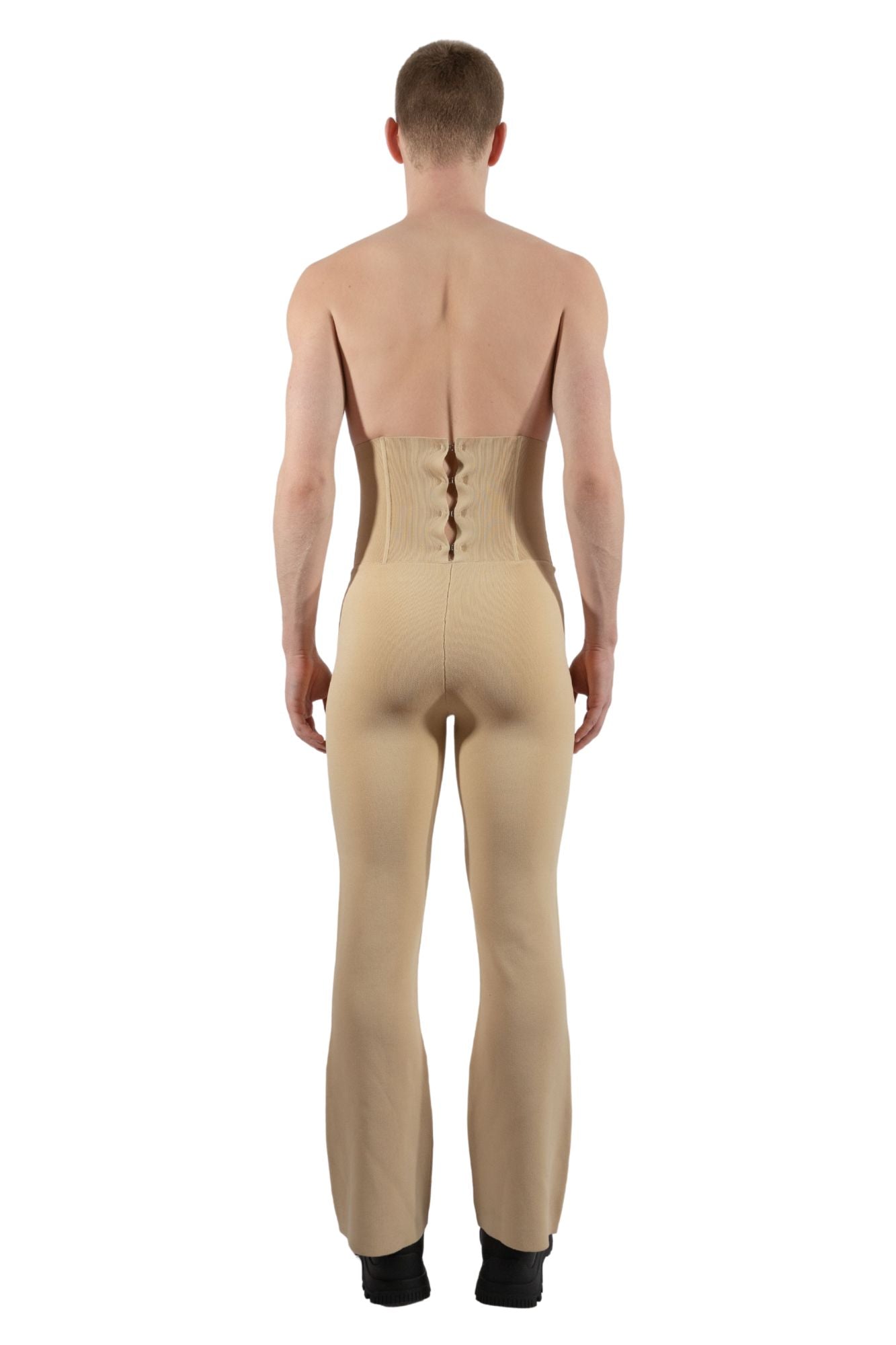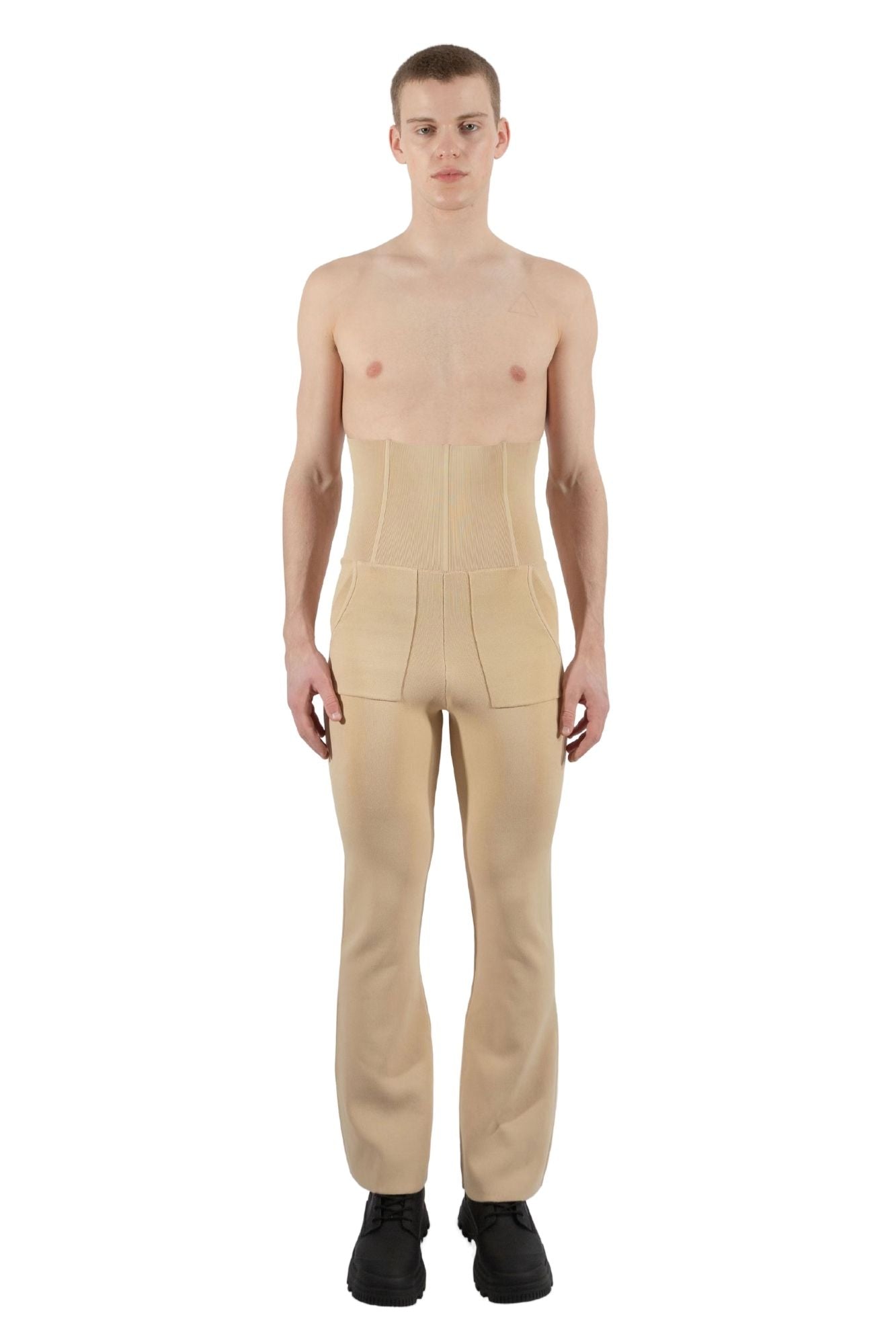 Corset style high-waisted pants with boning integrated through the front and back of the midsection. Featuring hook and eye hardware at the back for a form-fitting styling. Knitted in a slightly flared silhouette at the bottom. Designed with two pockets at the hips.