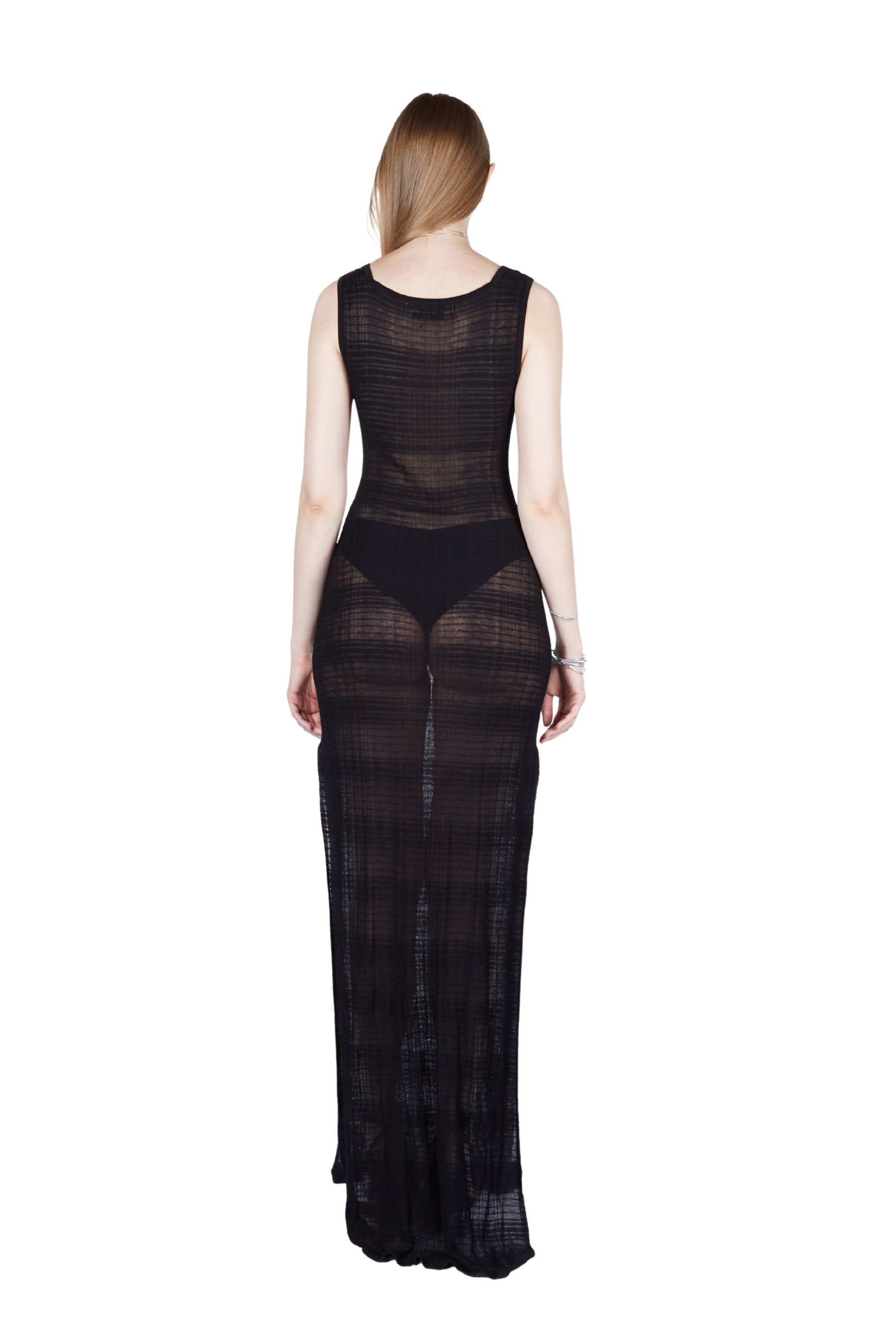 A sleeveless, scoop-neck maxi dress cut in a column silhouette that skims the body. Designed with a semi-sheer knit and side slit for lightweight and easy movement.