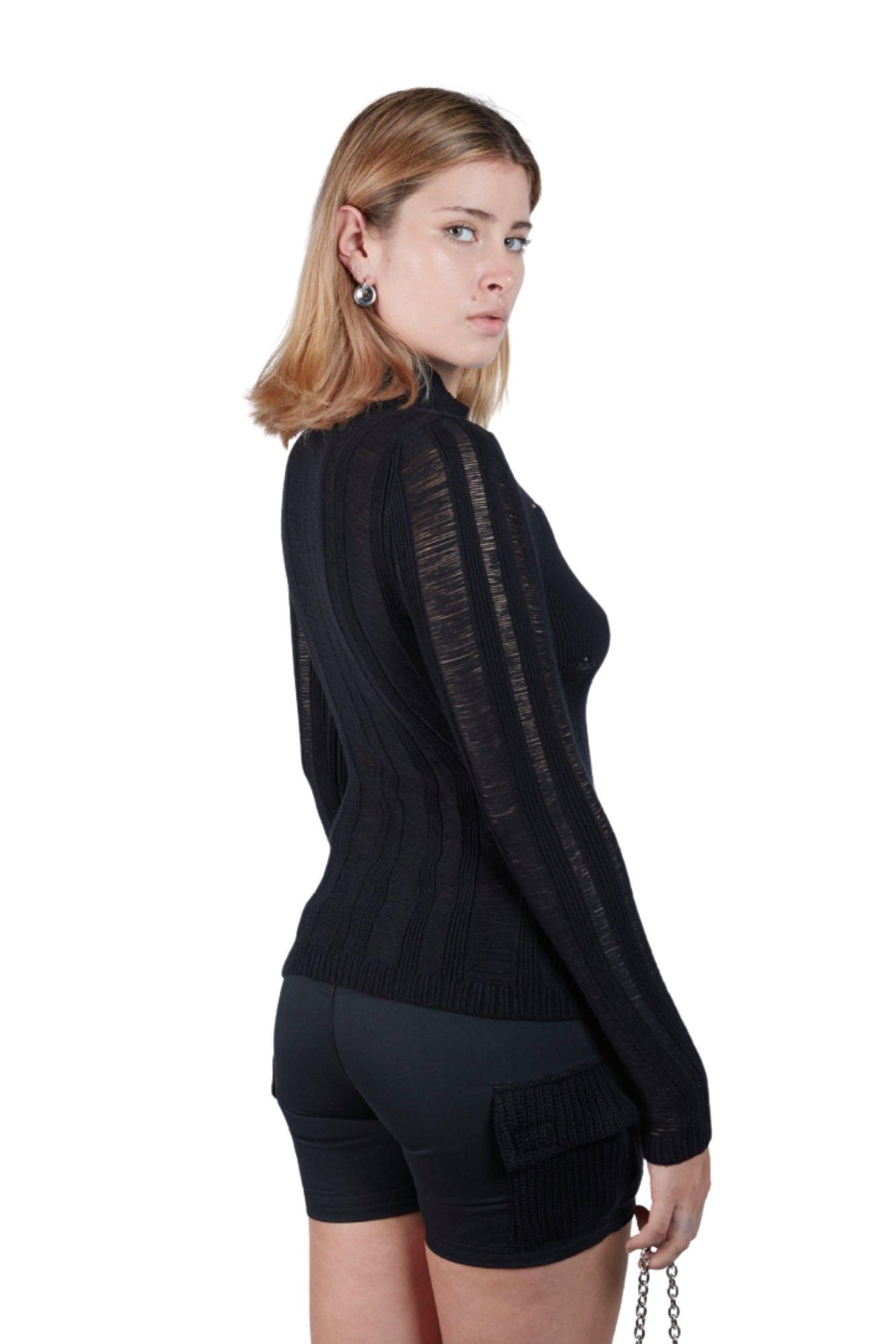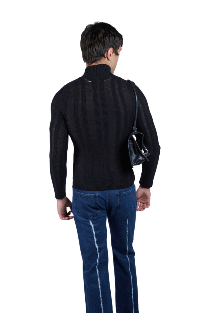Ladder-stitch top featuring an intricate open-knit pattern for a structured yet breathable look. Designed with a high mock neck and full-length zipper for versatile styling. Featuring ribbed textures, with a fitted silhouette for layering or a standalone piece.