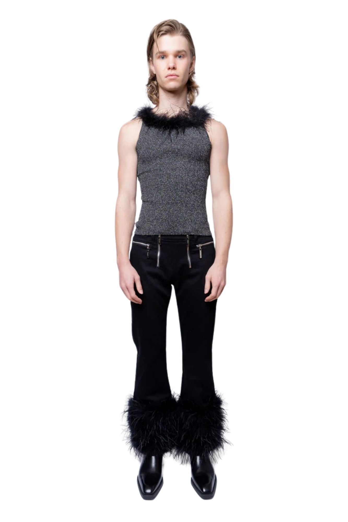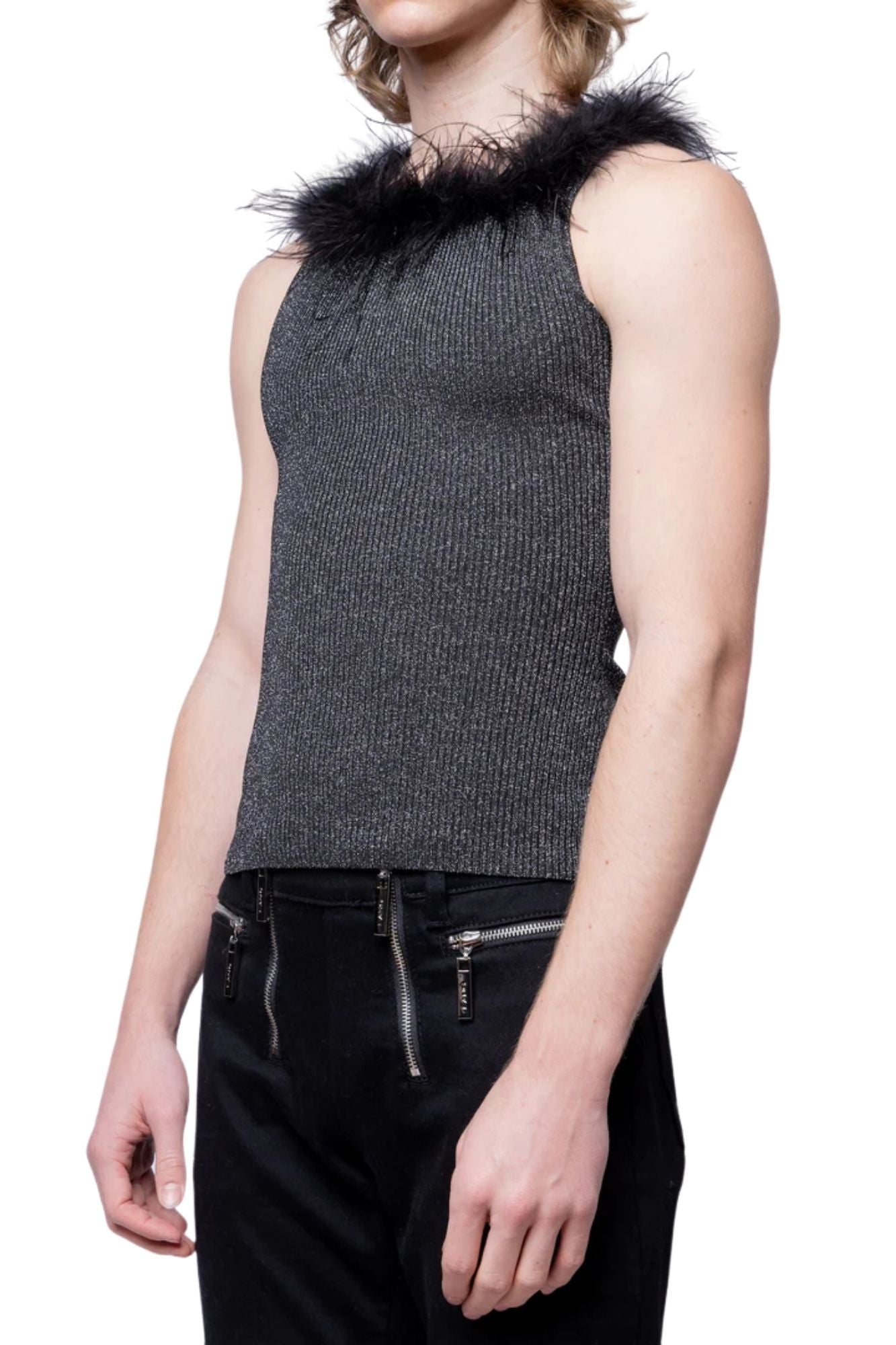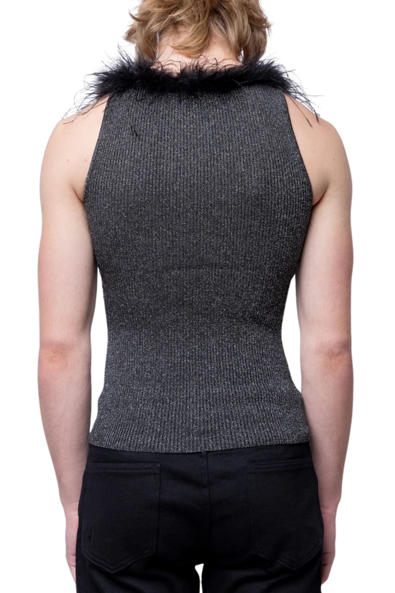 Ribbed tank crafted using a Lurex metallic yarn with a shimmer finish. Featuring plumage embellishment at the square neckline. Designed in a close-to-body and comfortable fit.