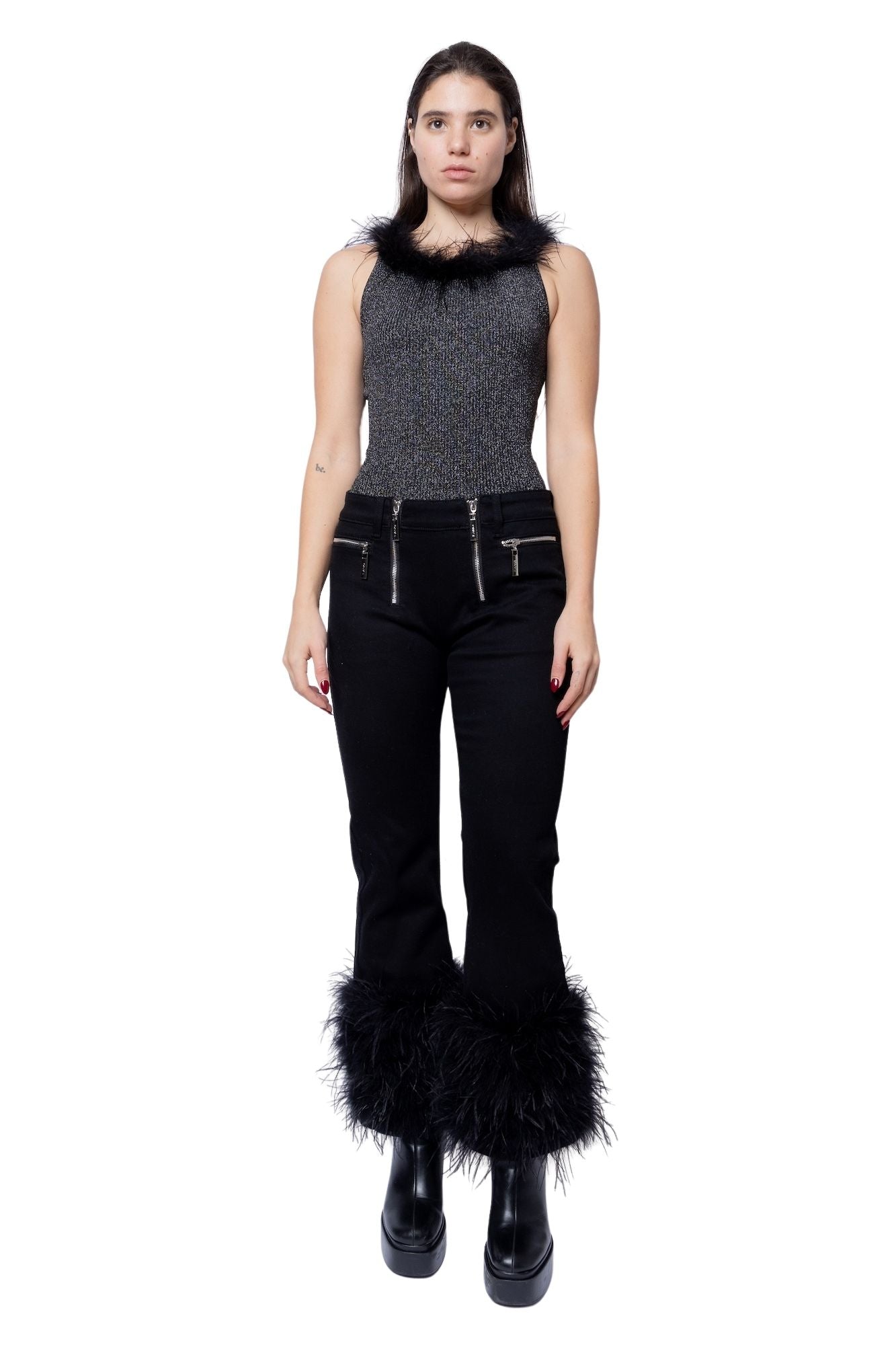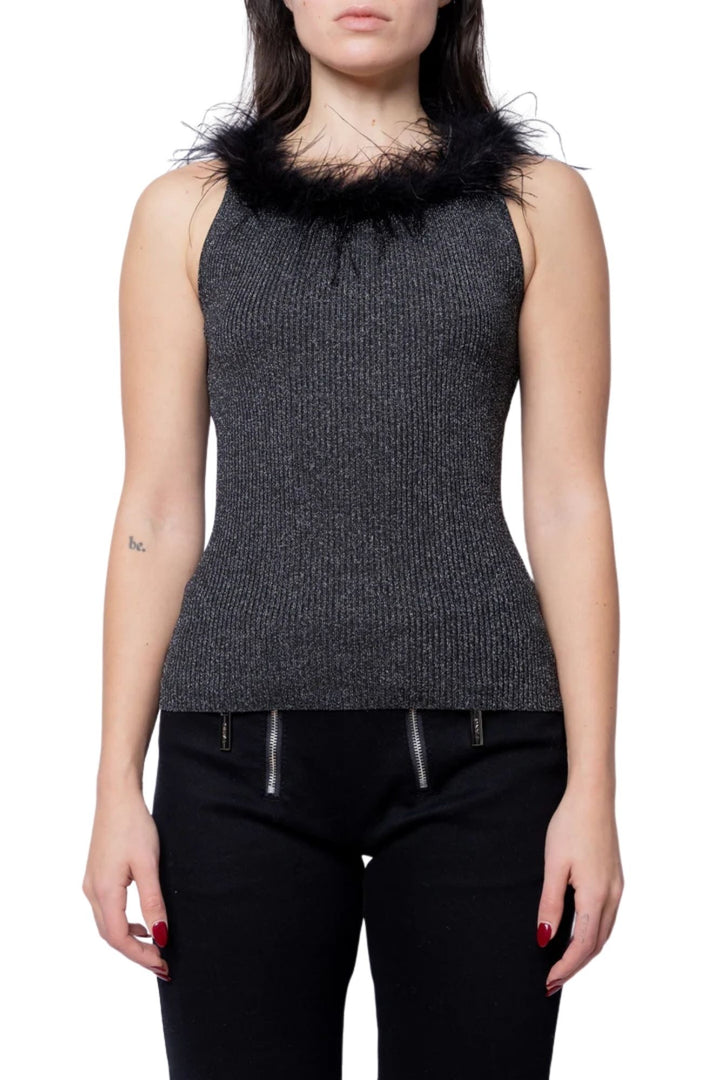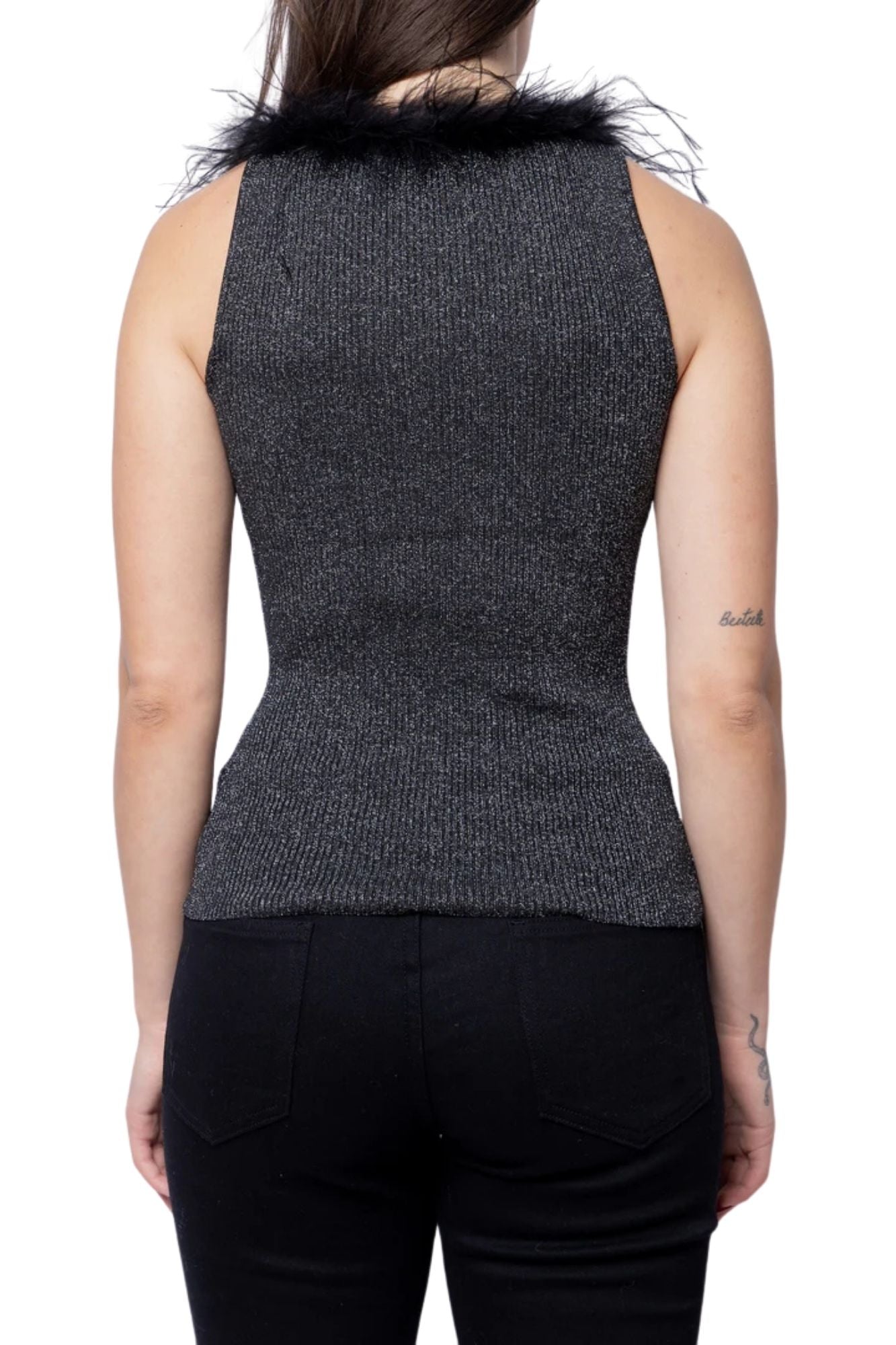 Ribbed tank crafted using a Lurex metallic yarn with a shimmer finish. Featuring plumage embellishment at the square neckline. Designed in a close-to-body and comfortable fit.