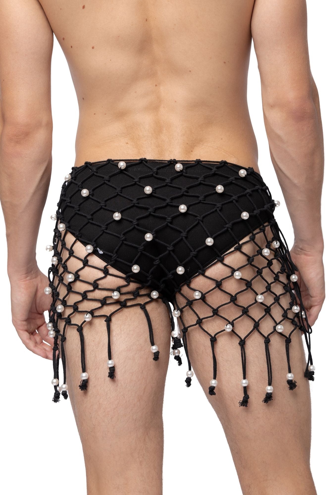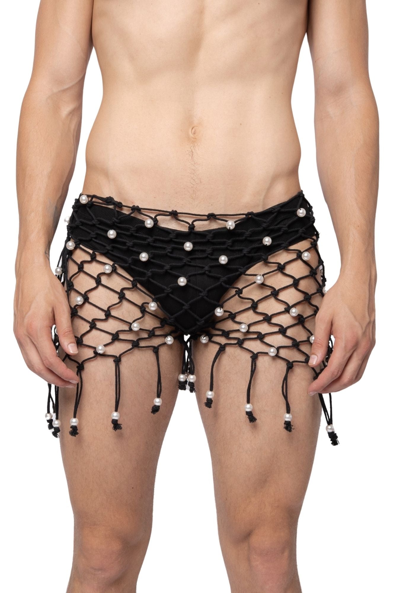 Midrise hand macrame shorts with pearl accents throughout. Featuring tassels at bottom opening, creating fluidity with motion. Crafted in a close-to-body fit.