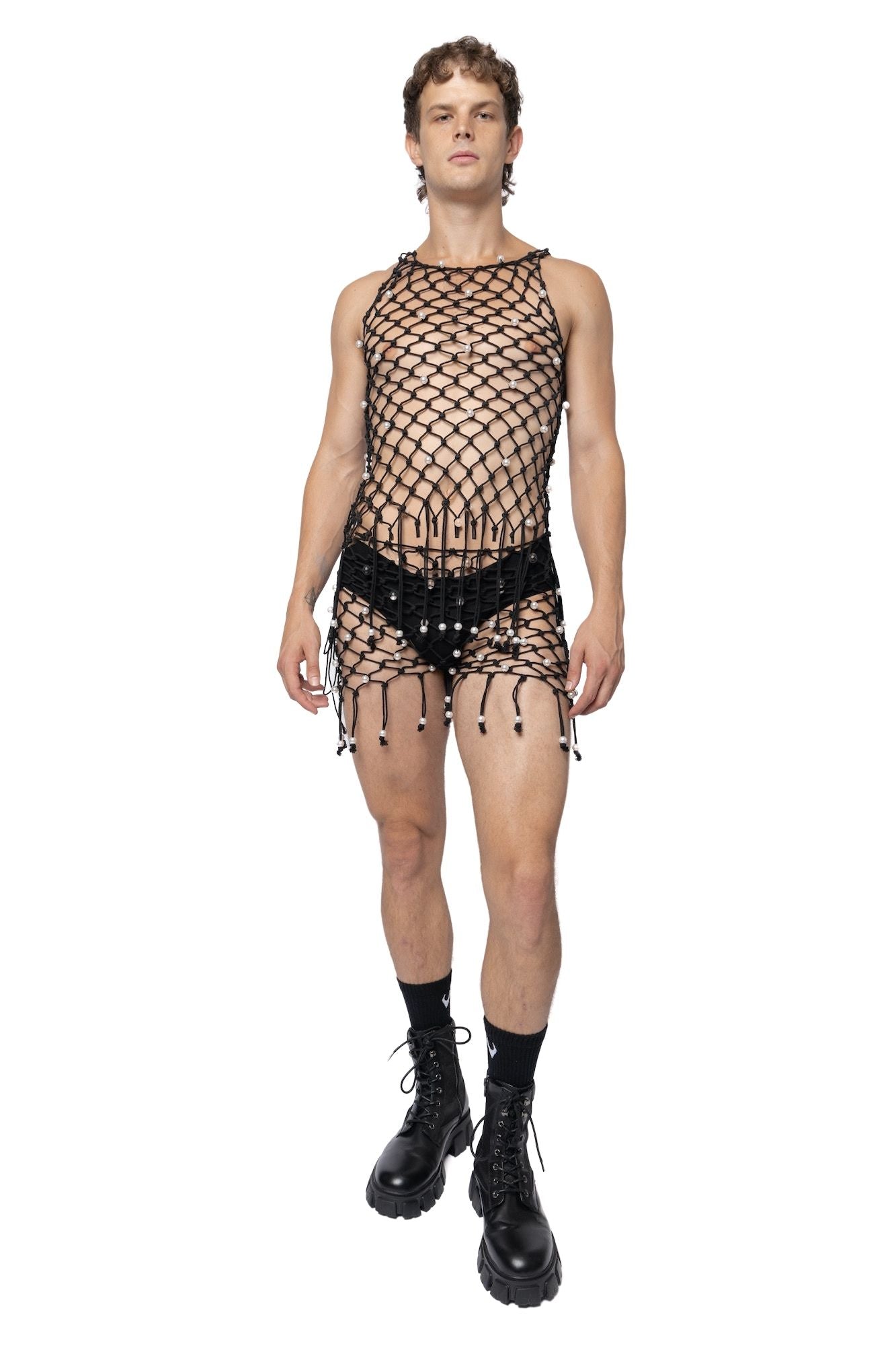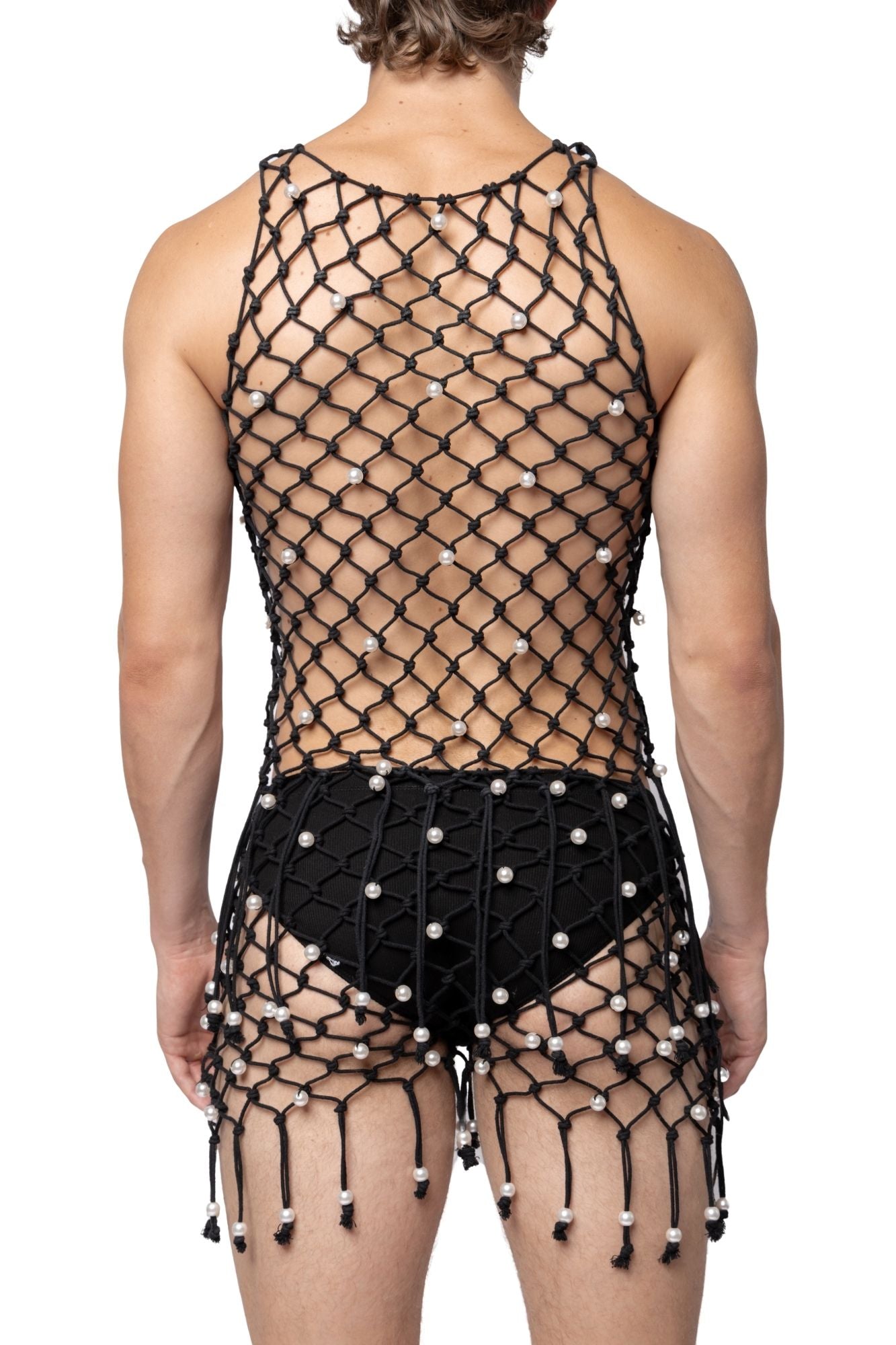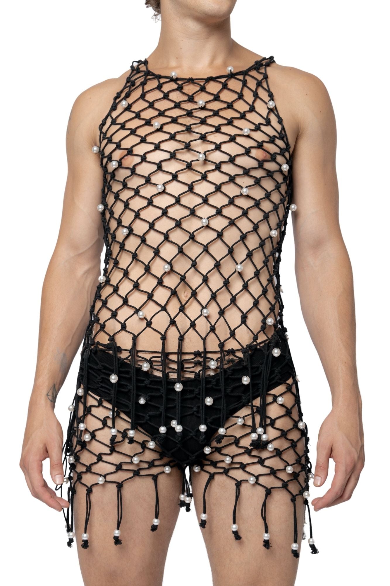 Hand macrame top with pearl accents throughout body. Featuring square neckline and tassels at bottom opening, creating fluidity with motion. Crafted in a close-to-body fit.