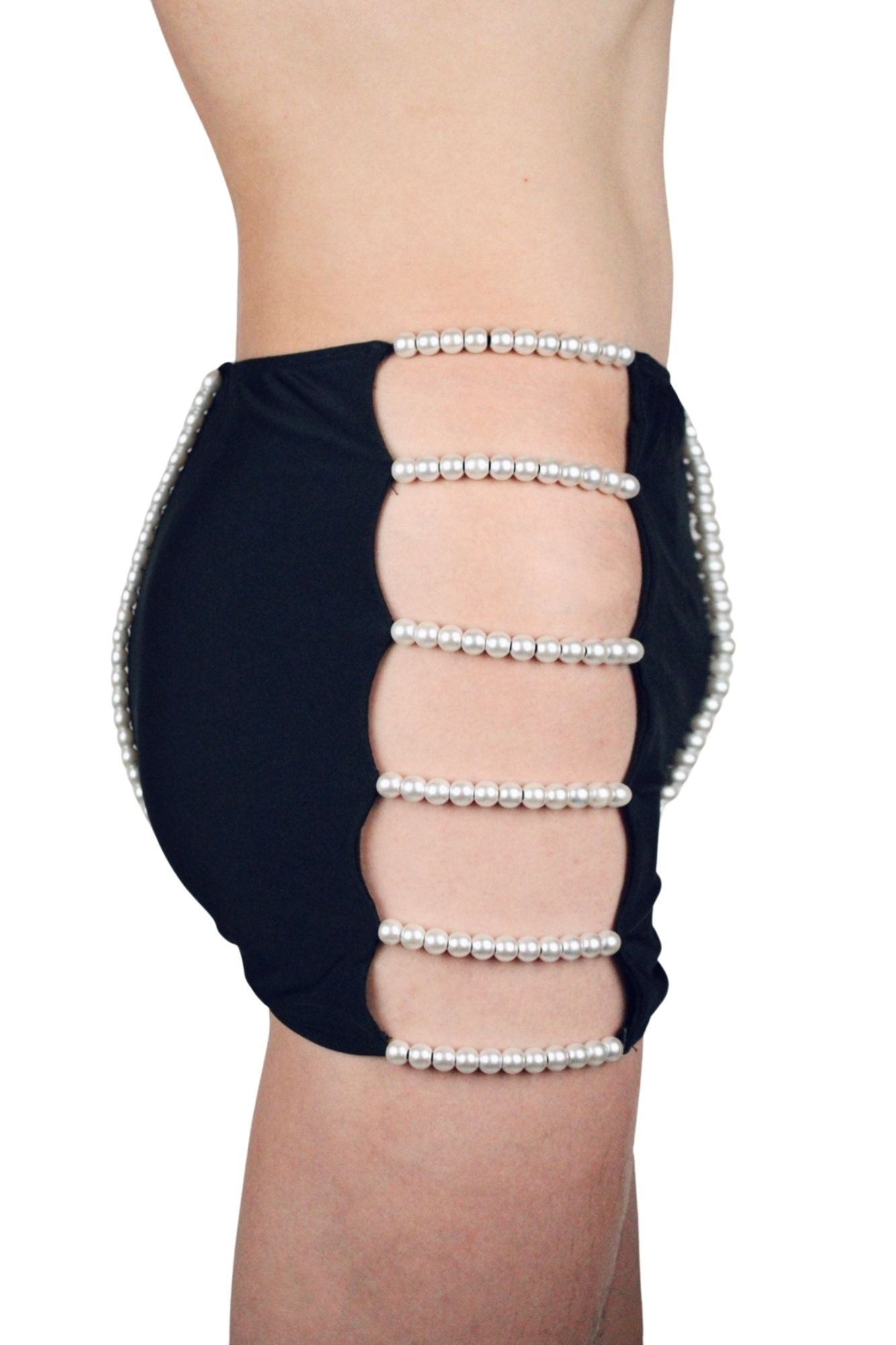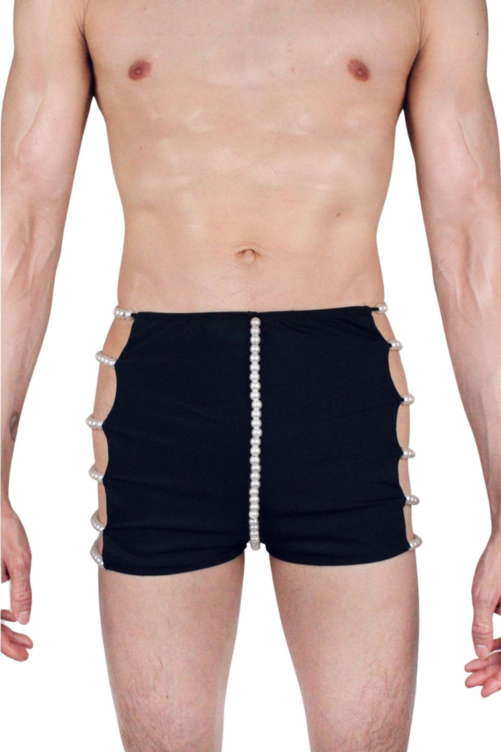 This unique pair of high-waisted swim trunks is inspired by midcentury swimwear for men and women. Romanticizing sensuality from another era that features our brand's signature high-waisted silhouette, these shorts are constructed with separate front and back panels that are strung together by strands of pearls. Cut-out on each side of the bathing suit creates fun pee-a-boo moments to show off your gams. Body conscious fit to complement your natural shape. Featuring our logo embroidery.