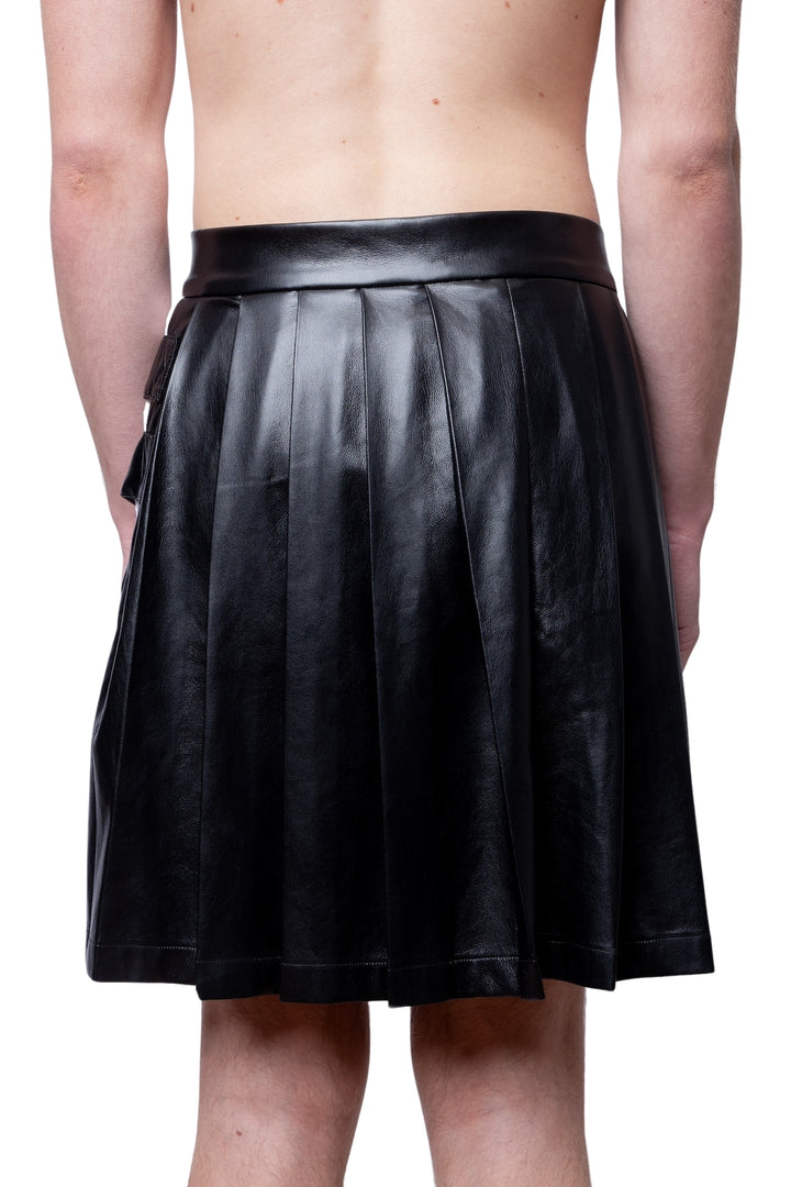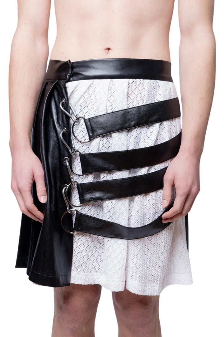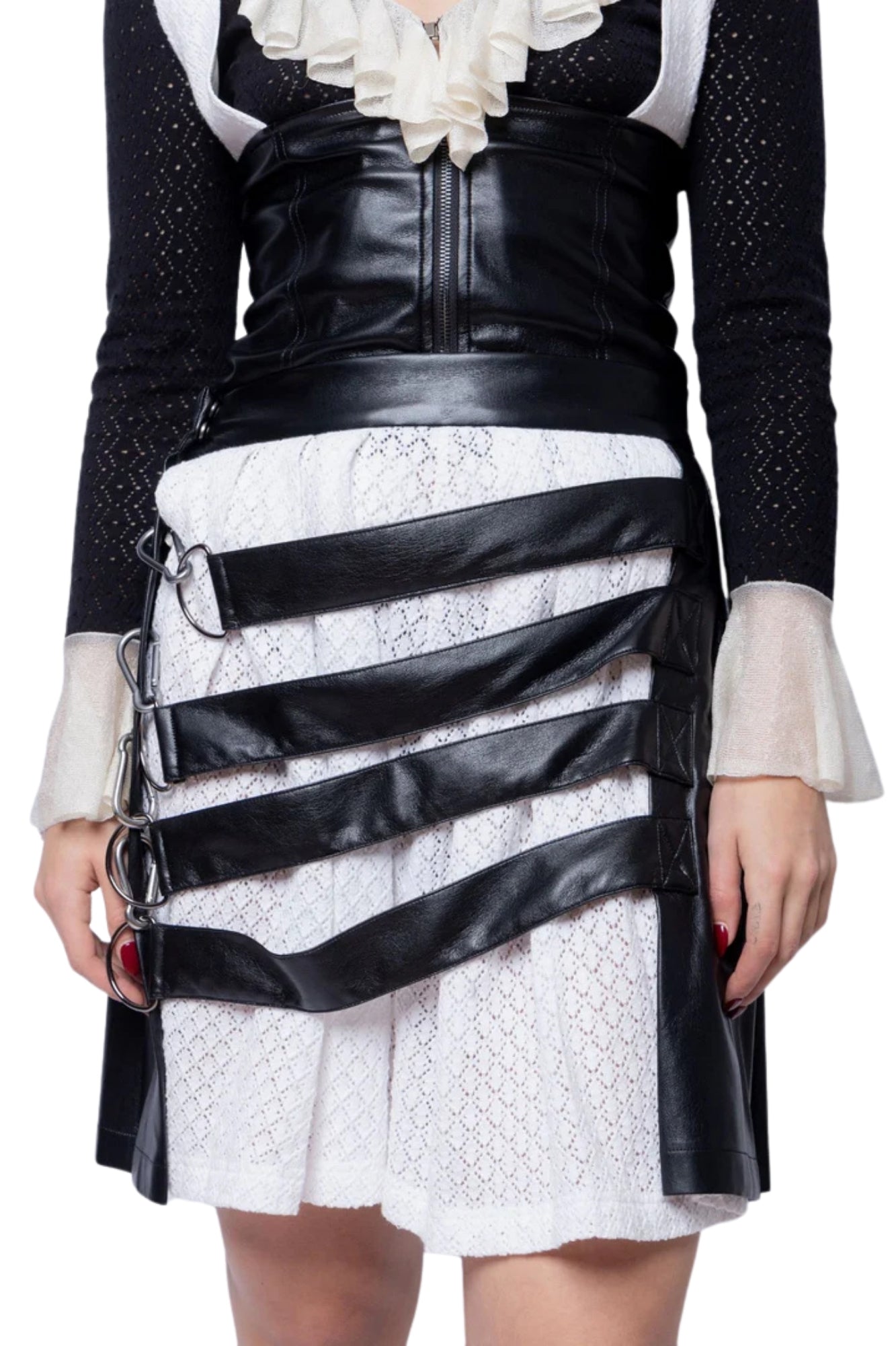 Pleated midi-length skirt blending soft pointelle knit with calf leather. Front and back panels are linked by carabiner and leather strap embellishments. Designed with adjustable snap closure at waistband for easy wear and a flexible fit.
