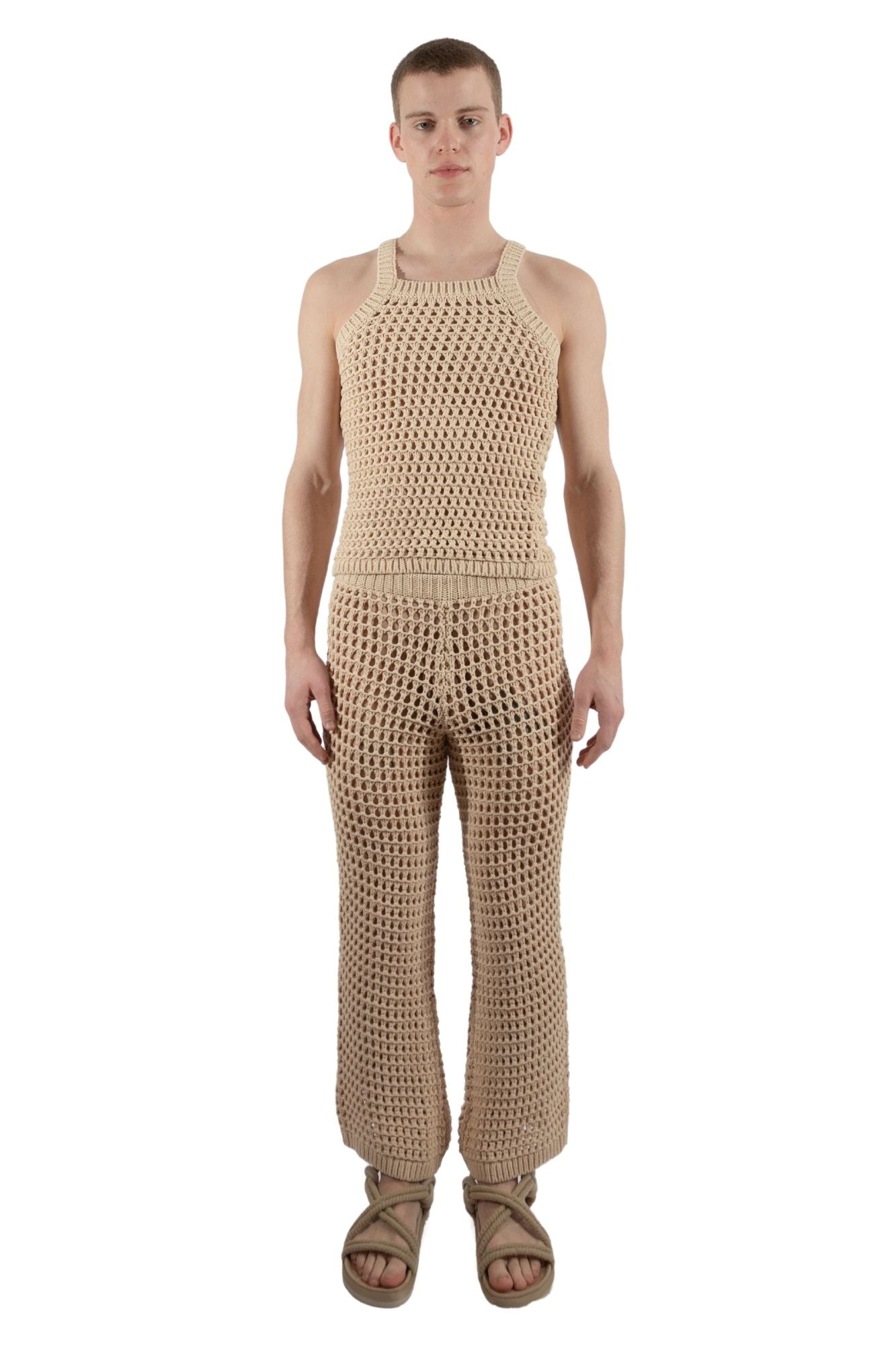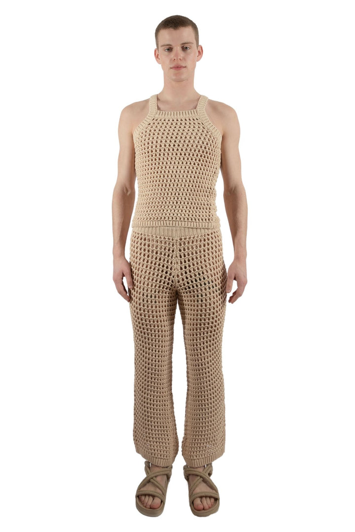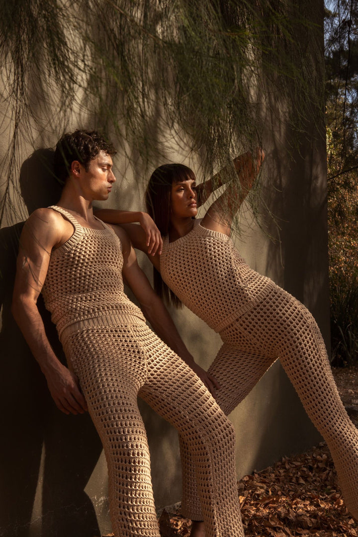 Pointelle knit pants constructed using thick-gauged premium cotton yarn, that slightly flares out at the bottom. Loops throughout create a peekaboo effect as well as making it breathable. Perfect for a swim coverup, or complete the set by pairing with the matching Pointelle Loop Top.