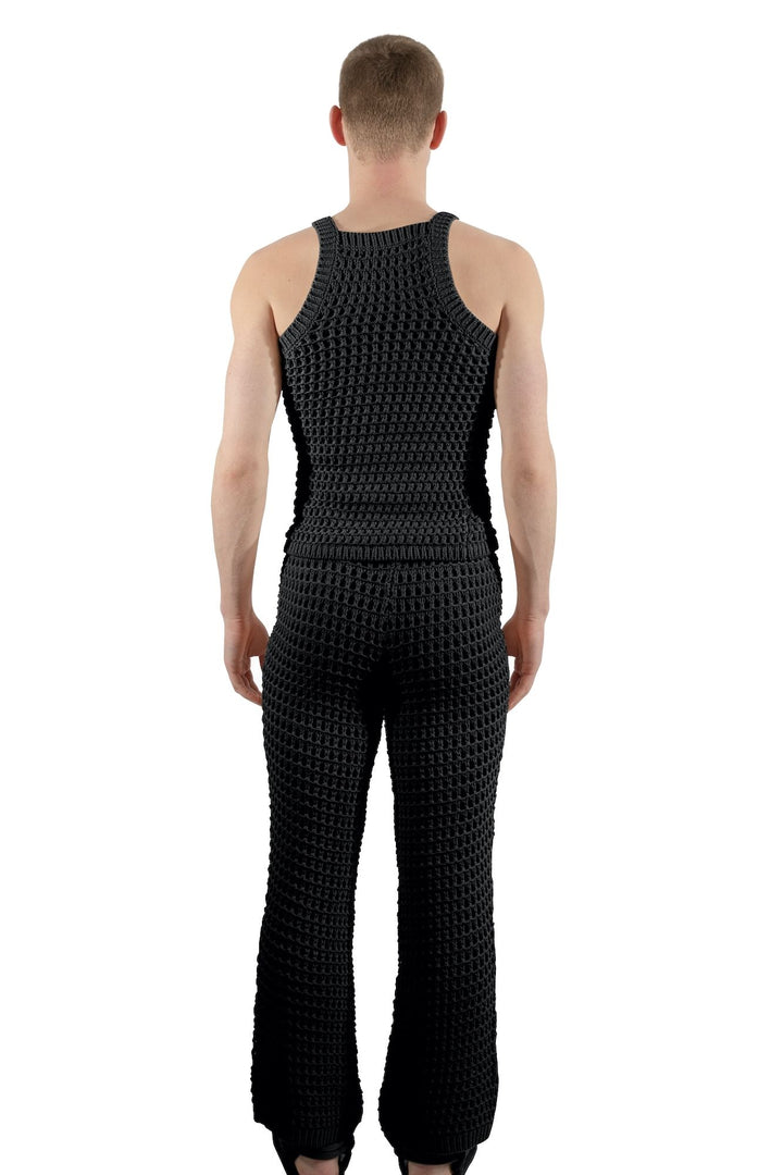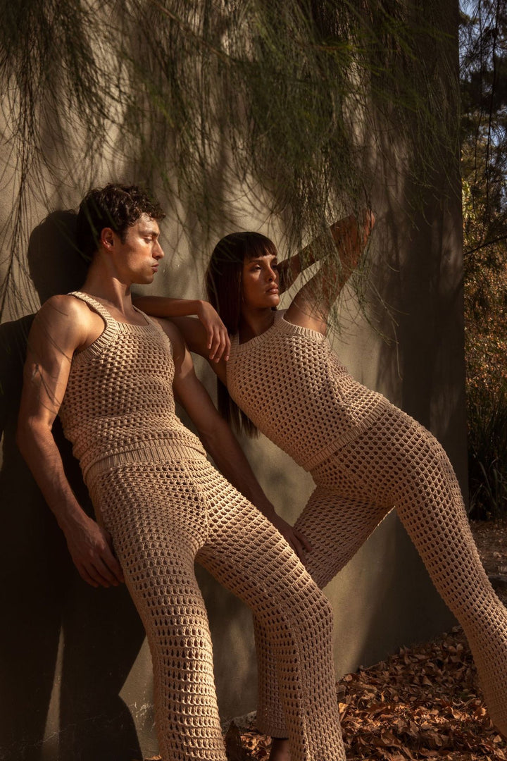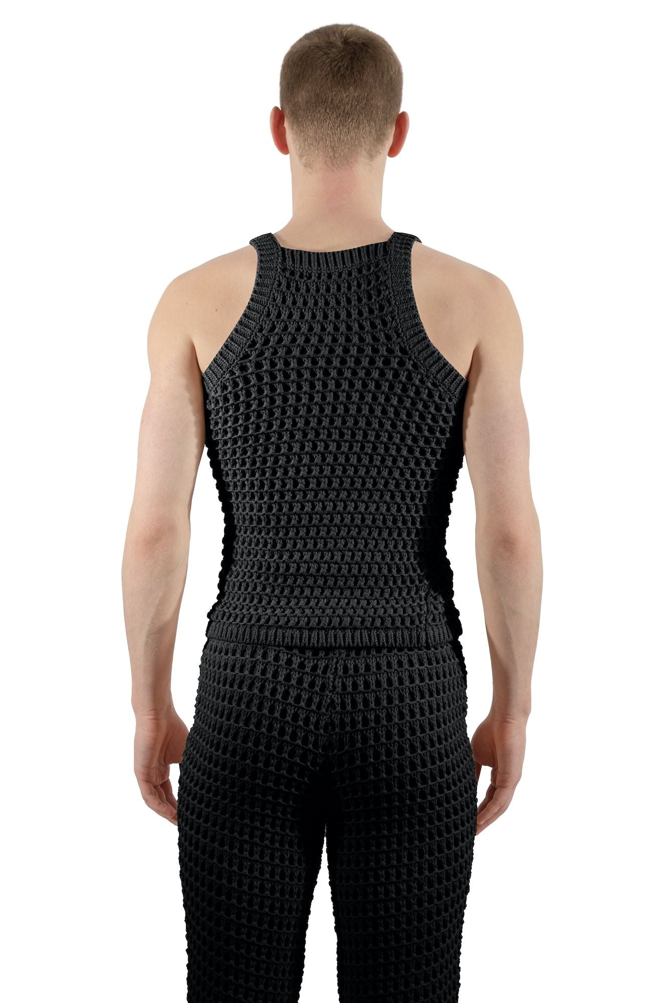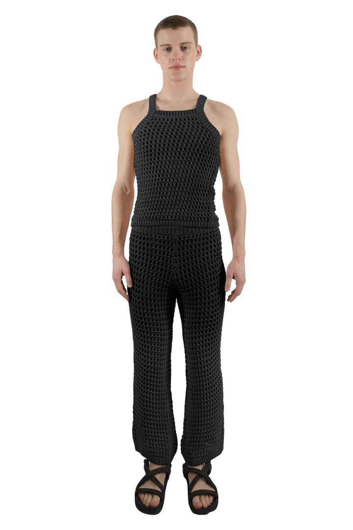 A pointelle knit tank constructed using thick-gauged premium cotton yarn that hugs the body without losing its openwork geometric detail. Loops throughout create a peekaboo effect as well as making it breathable. Mid-rise fit.