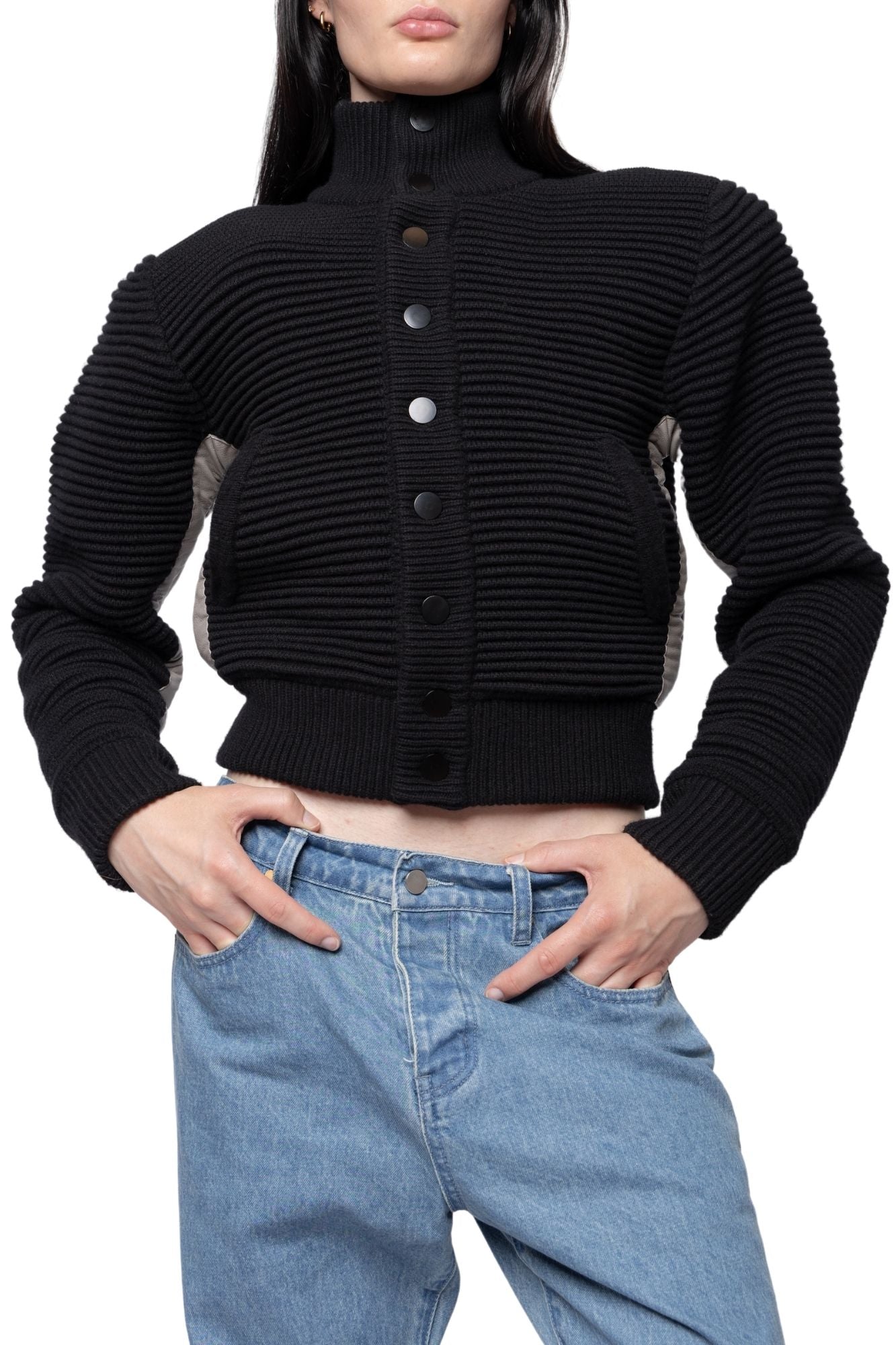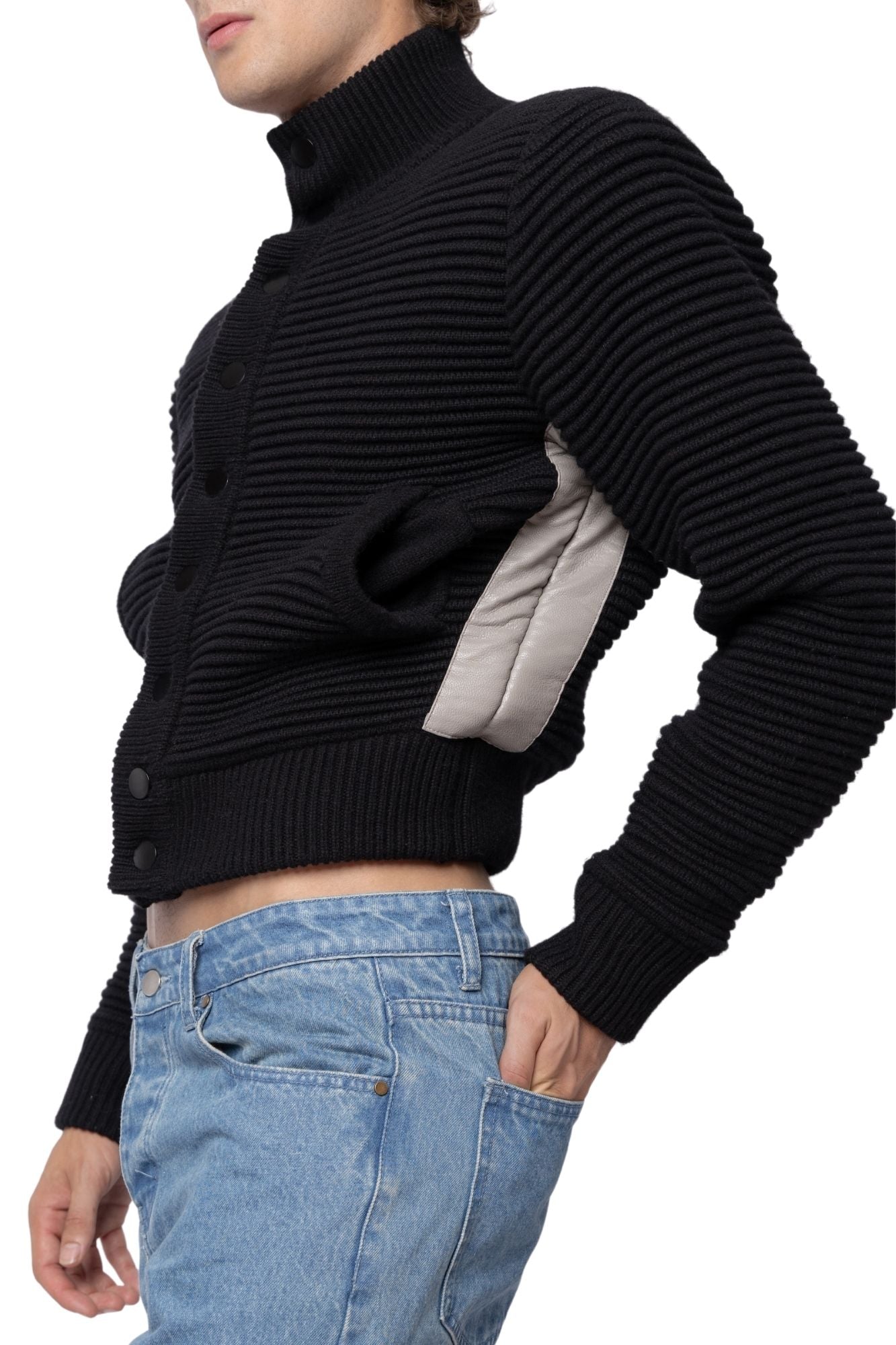 A heavy-duty bomber jacket crafted from organic soft wool in a dramatized ottoman stitch with calf leather detailing along its sides and sleeves. A geometric and defined silhouette with broad shoulders and a cinched waist. Two pockets, high collar, ribbed cuffs, as well as substantial lining for premium insolation. Frontal snap-button closure at center front.