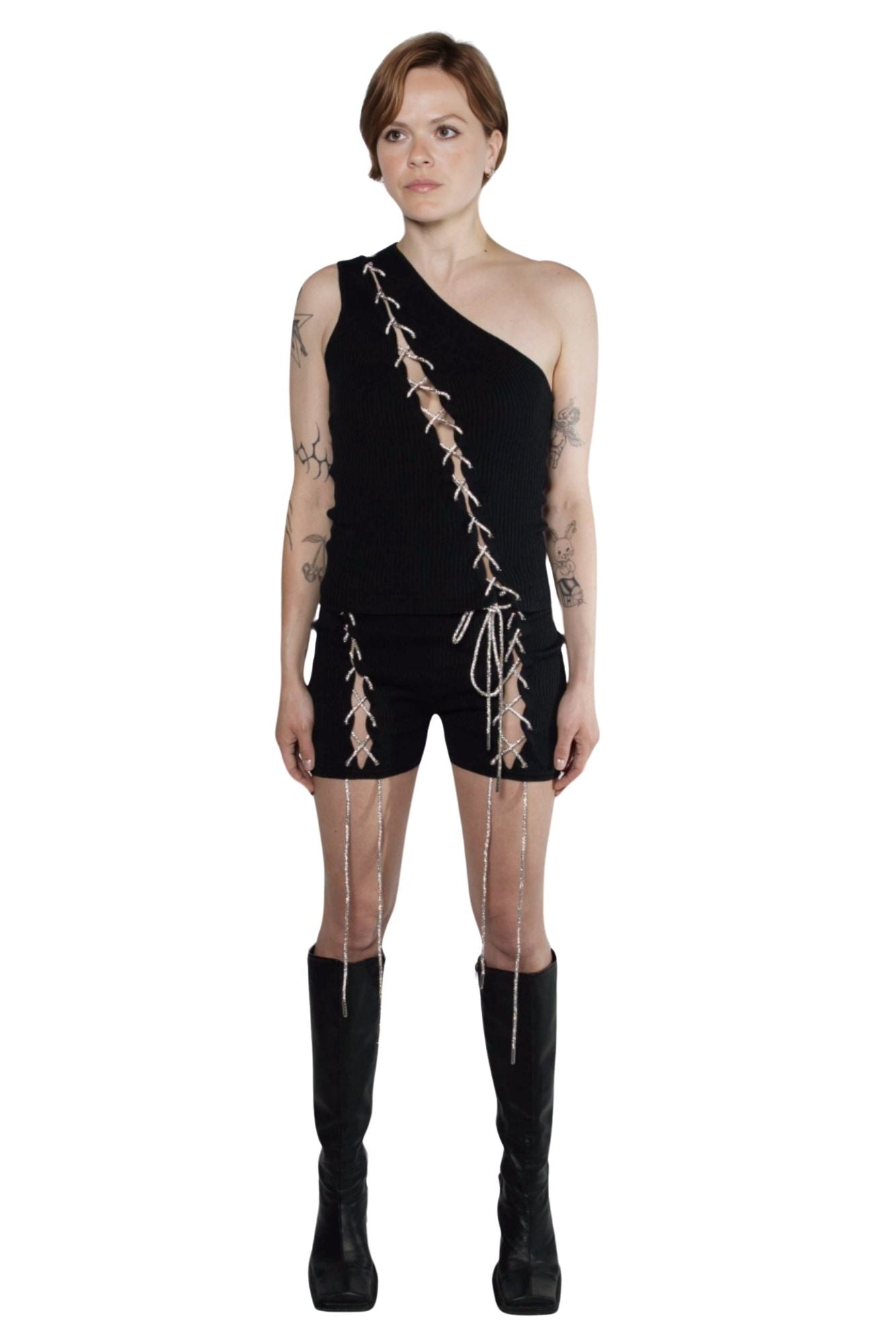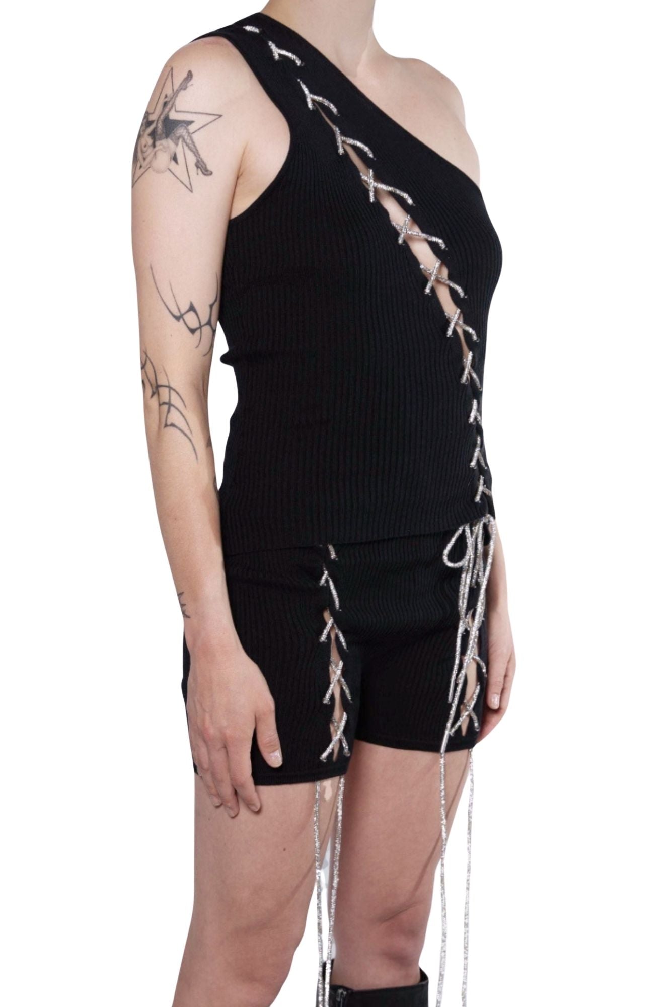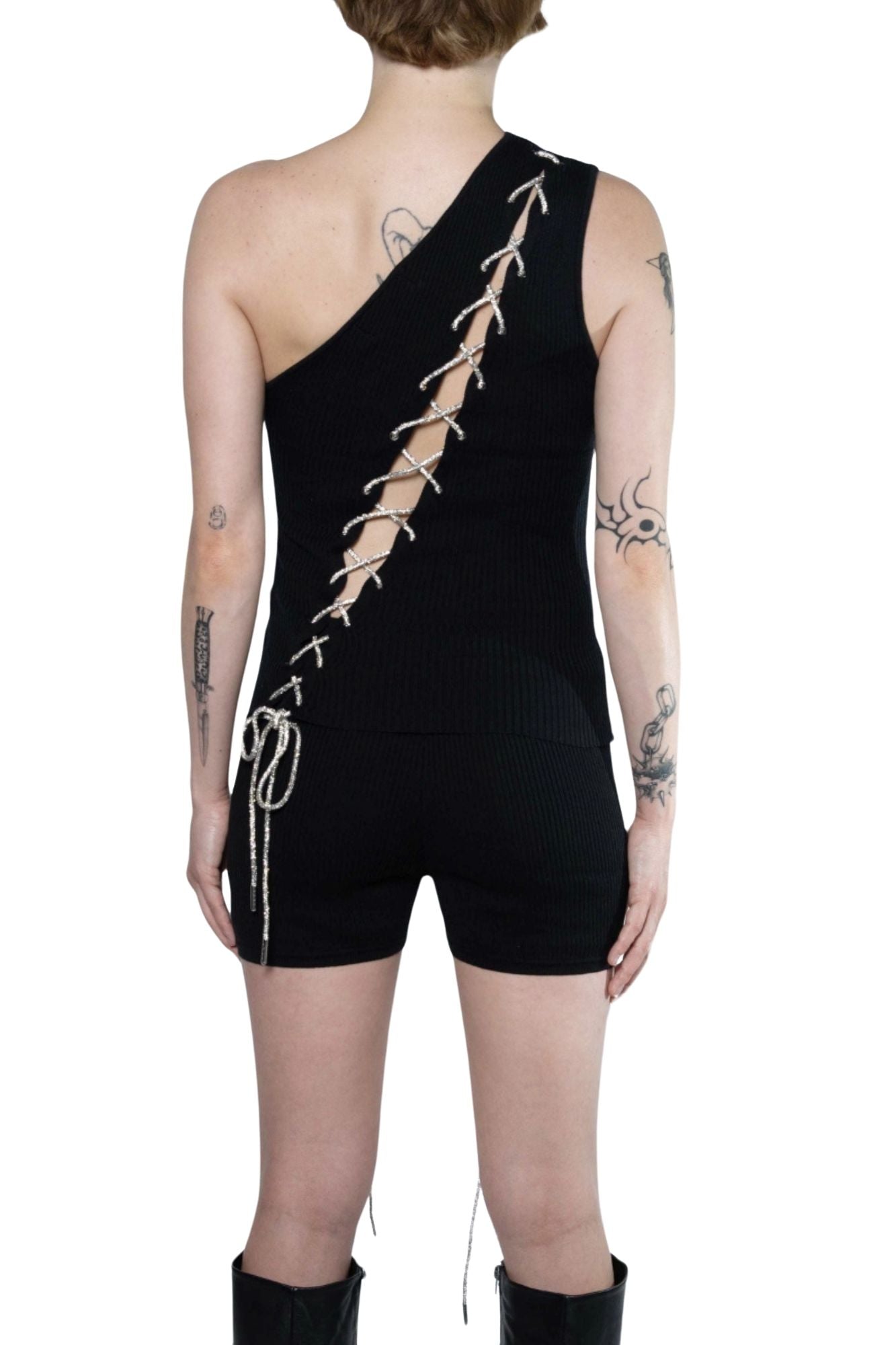 One-shoulder asymmetrical ribbed top featuring diagonal cut-out across front and back body. Functional drawstring lace-up detail with adjustable styling. Knitted with a lightweight cotton/ modal blend for a comfortable, close-to-body fit.