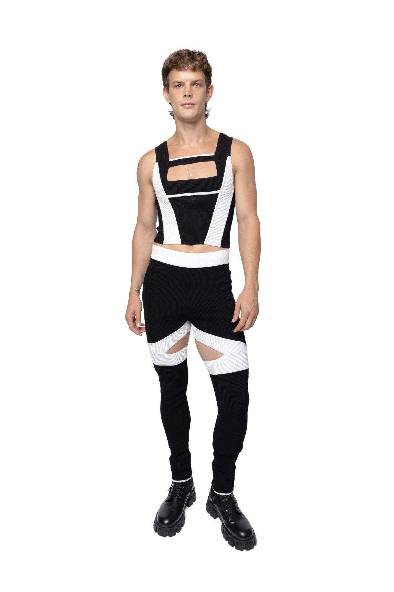 Mid to high-rise pants constructed with ribbed technical knit panels that form geometric patterns. Featuring a diamond-shaped cut-out at the inner thigh, elastic waistband, as well as a next-to-skin leg fit.