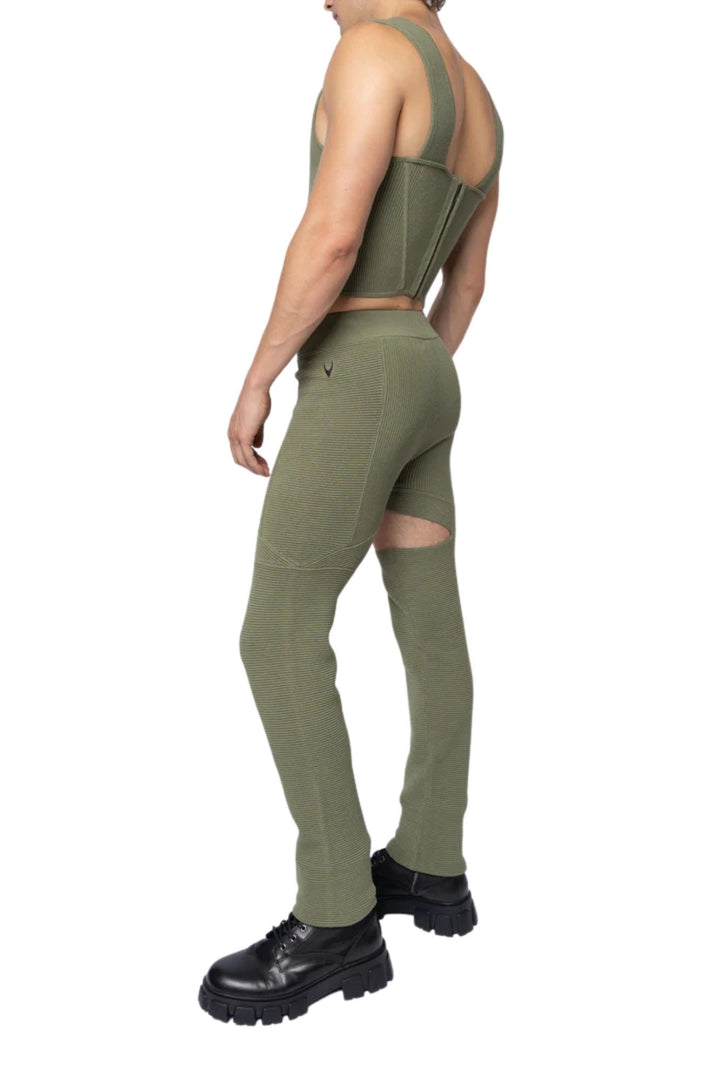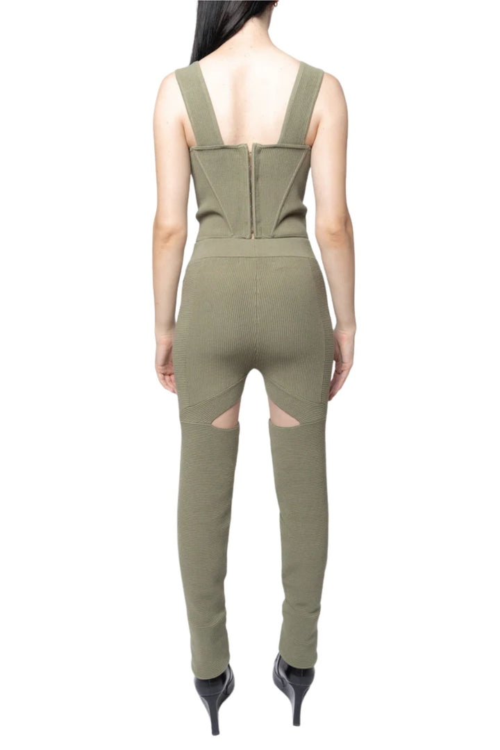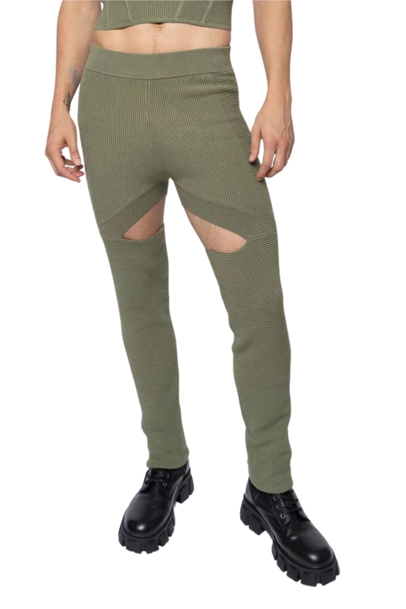 Mid to high-rise pants constructed with ribbed technical knit panels that form geometric patterns. Featuring a diamond-shaped cut-out at the inner thigh, elastic waistband, as well as a next-to-skin leg fit.