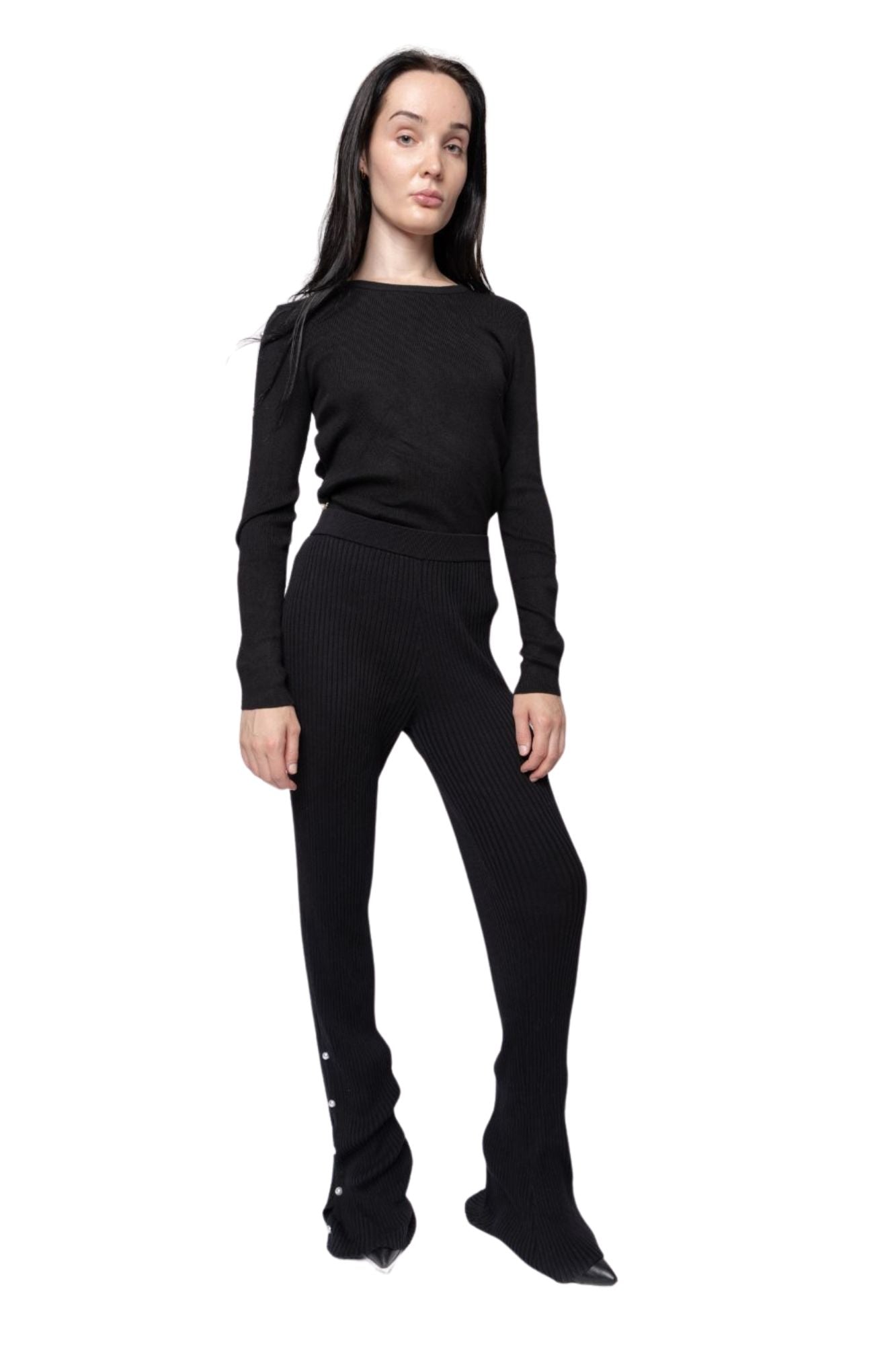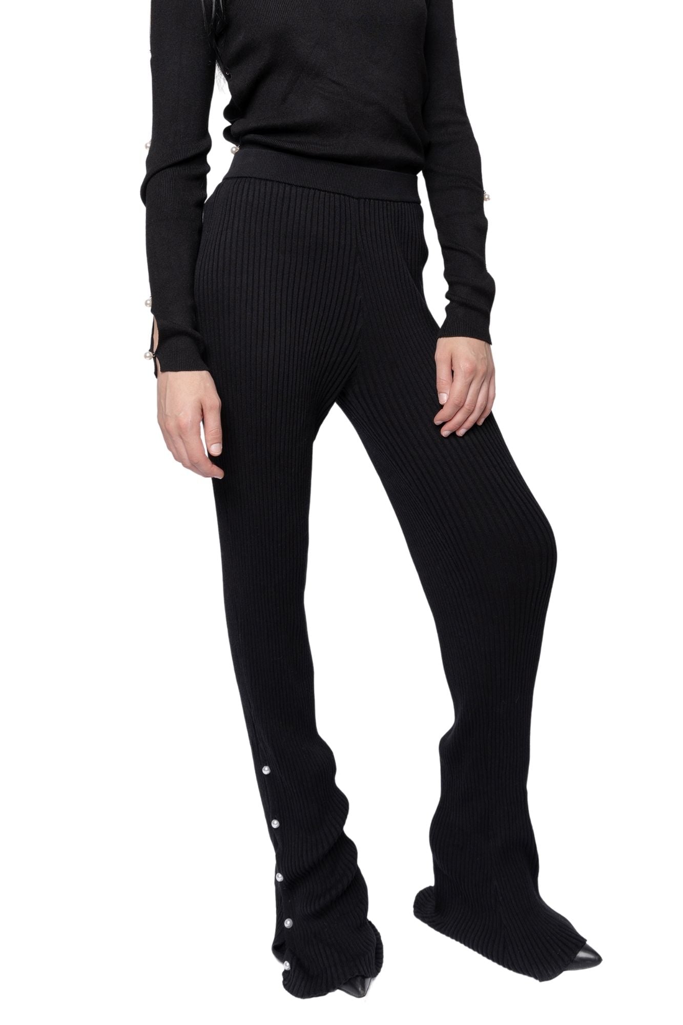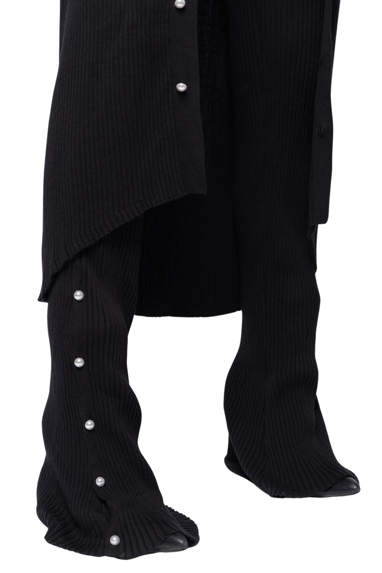 Mid to high-rise ribbed bottoms with pearl button accents at each leg opening. Knitted into a slit fit through the thigh with a slightly flared leg.