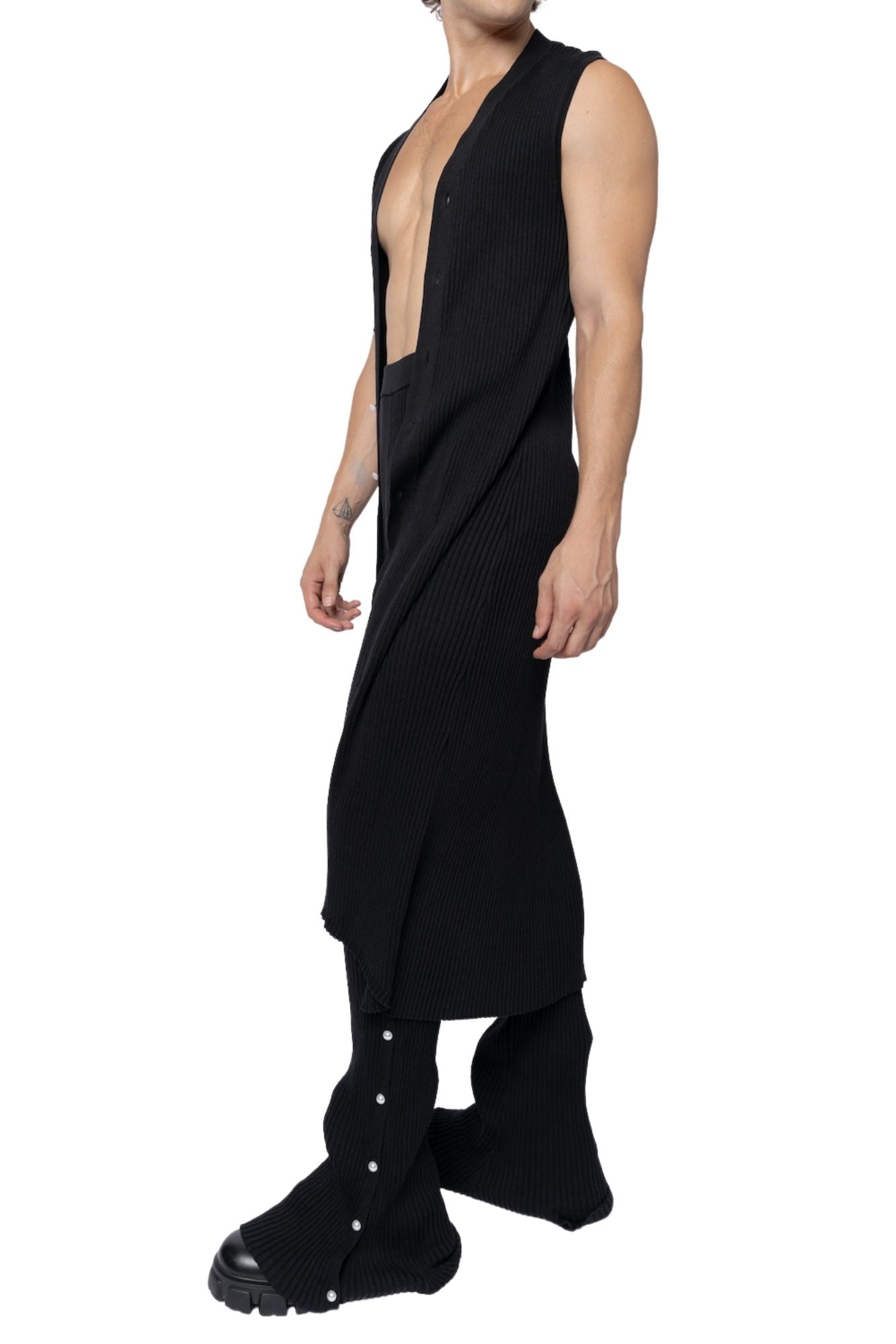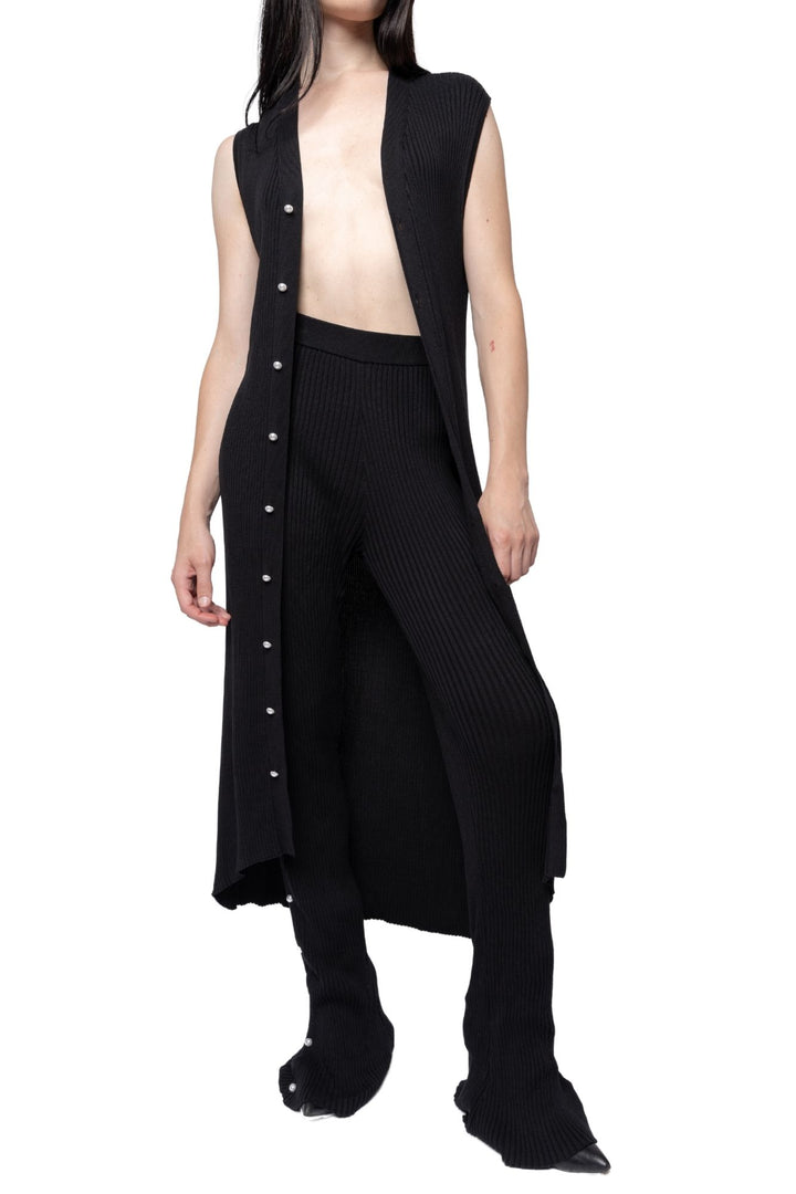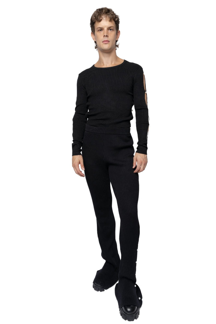 Mid to high-rise ribbed bottoms with pearl button accents at each leg opening. Knitted into a slit fit through the thigh with a slightly flared leg.