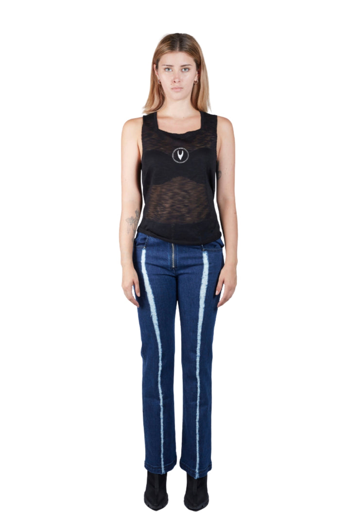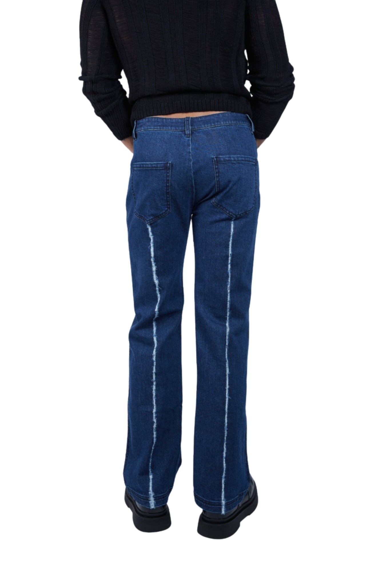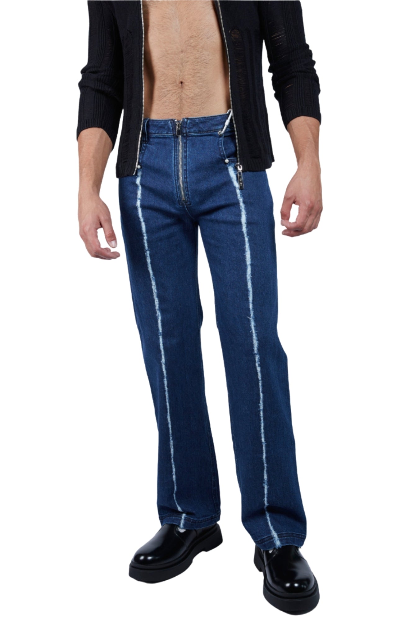 Straight-leg denim pants with distressed detailing along the center of each leg. Featuring our signature logo zipper at the front and a custom carabiner accent. Designed with a four-pocket construction, including two square front pockets.